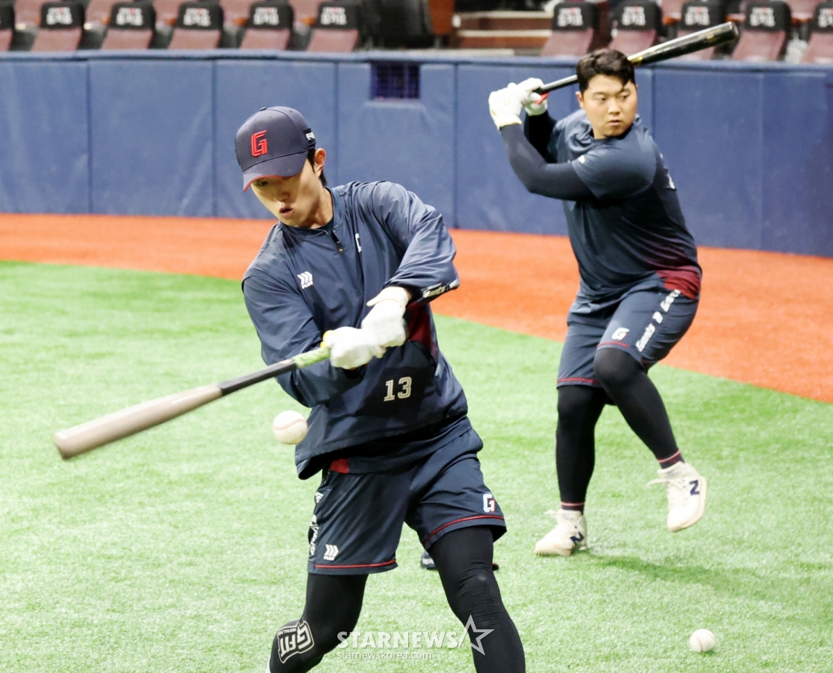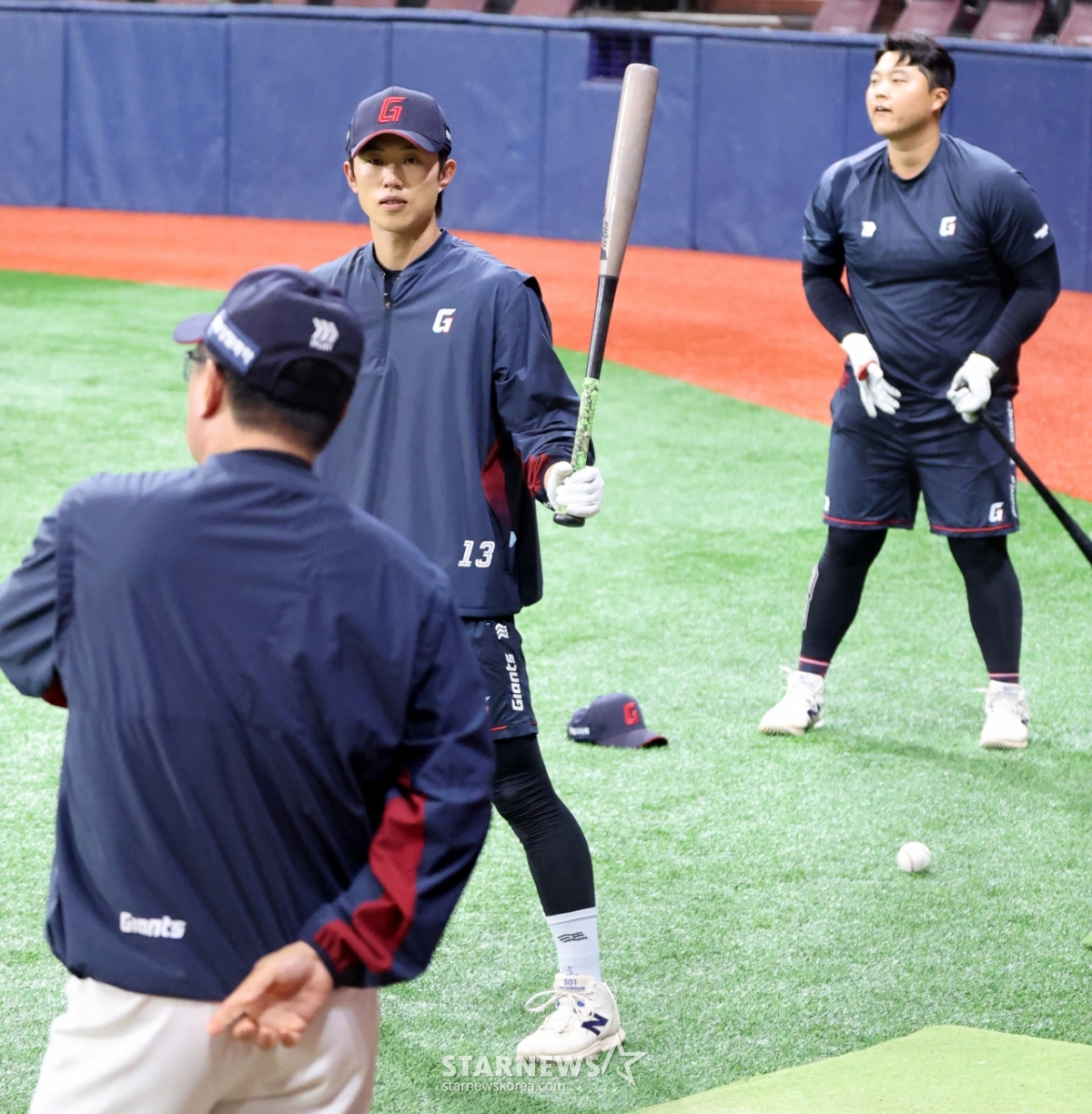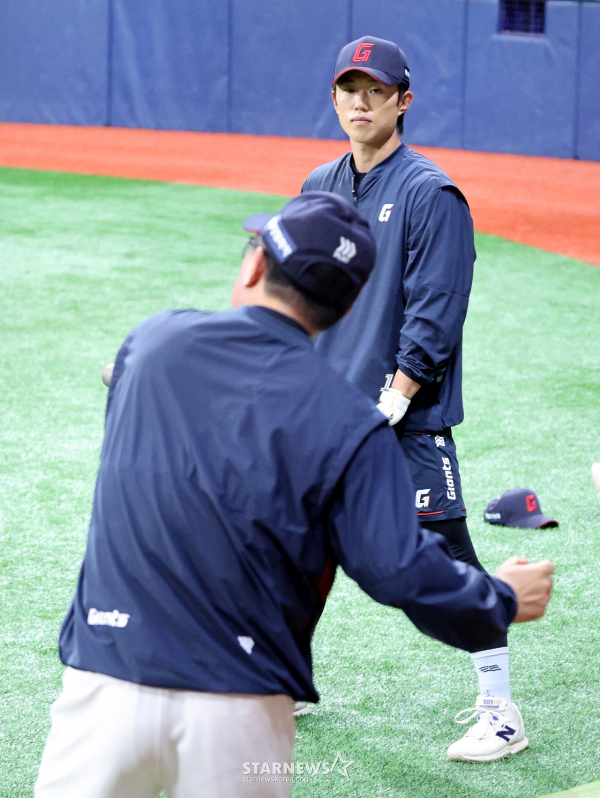 Lotte Jeon Min Jae đang được huấn luyện bởi huấn luyện viên Kim Tae Hyung trong quá trình huấn luyện đánh bóng trước trận đấu giữa Lotte Giants tại giải KBO 2026 được tổ chức tại Gocheok Sky Dome vào ngày 12. 2026.04.12.