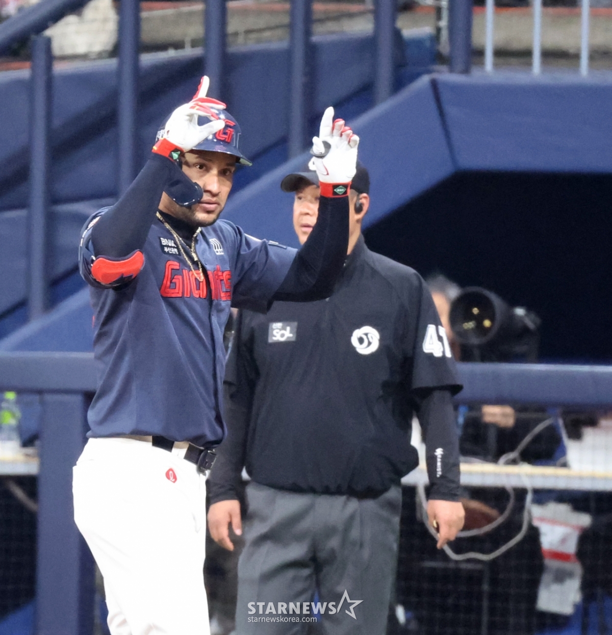 Cầu thủ đánh bóng thứ hai của Lotte, Reyes, đang xuất phát với một cú đánh trúng bóng ở đầu hiệp 6 của trận đấu giữa Lotte Giants và Kirum Heroes diễn ra tại Gocheok Sky Dome vào ngày 12. 2026.04.12.
