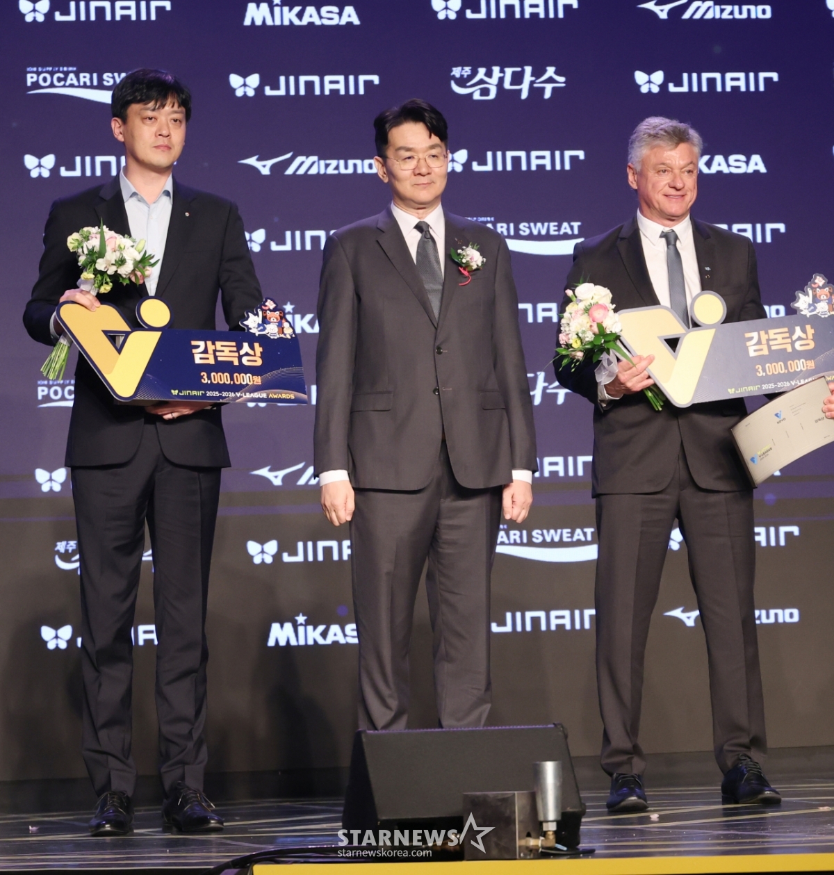 Huấn luyện viên Lee Young-taek của GS Caltex và huấn luyện viên của hãng hàng không Hàn Quốc Henan Dal tạo dáng sau khi nhận được giải thưởng huấn luyện viên của Chủ tịch Cho Won-tae.