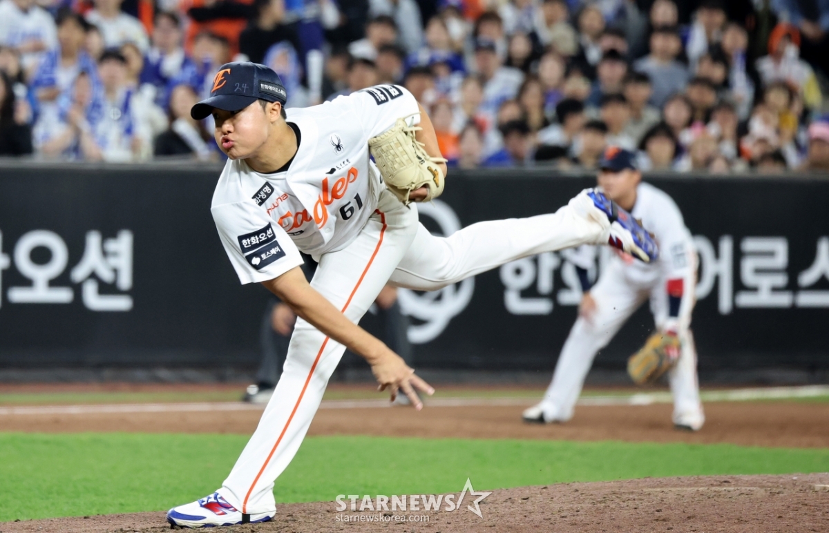 Jung Woo-ju của Hanwha Woo Wan Bullpen đang chơi ở đầu hiệp thứ 7 của trận đấu giữa Hanwha Eagle và Samsung Lions tại giải đấu 2026 KBO League được tổ chức tại Công viên bóng chày sinh mệnh Hanwha ở Daejeon vào ngày 14. 2026.04.14.