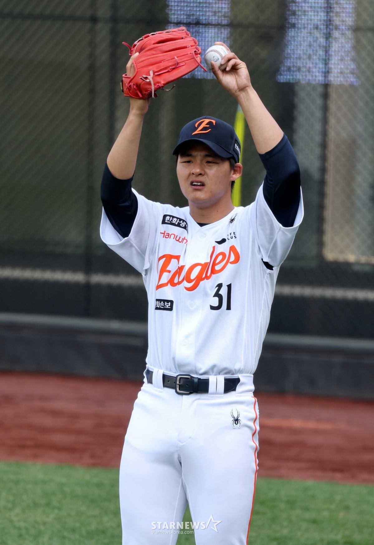 Lee Kyo-hoon của Hanwha, người đã trao đổi với Son A-seop vào ngày hôm trước, đang khởi động bằng cách ném bóng trước trận đấu giữa Hanwha Eagle ở giải đấu 2026 KBO League và Samsung Lions ở Daejeon vào ngày 15. 2026.04.15.