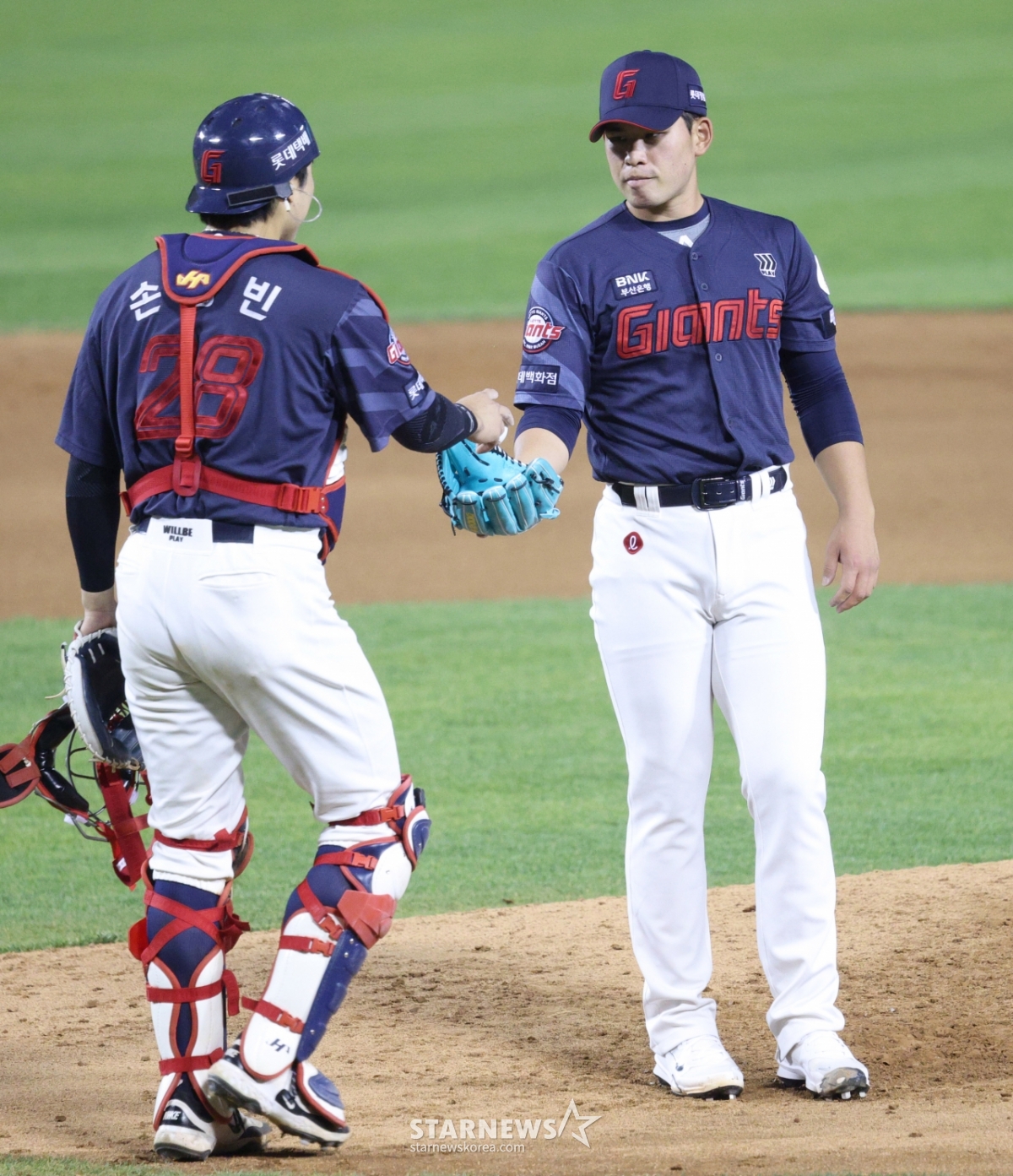 Khi Kim Jin-wook, tuyển thủ của Lotte, bị rung chuyển, Son Sung-bin leo lên gò đất và trấn tĩnh lại.
