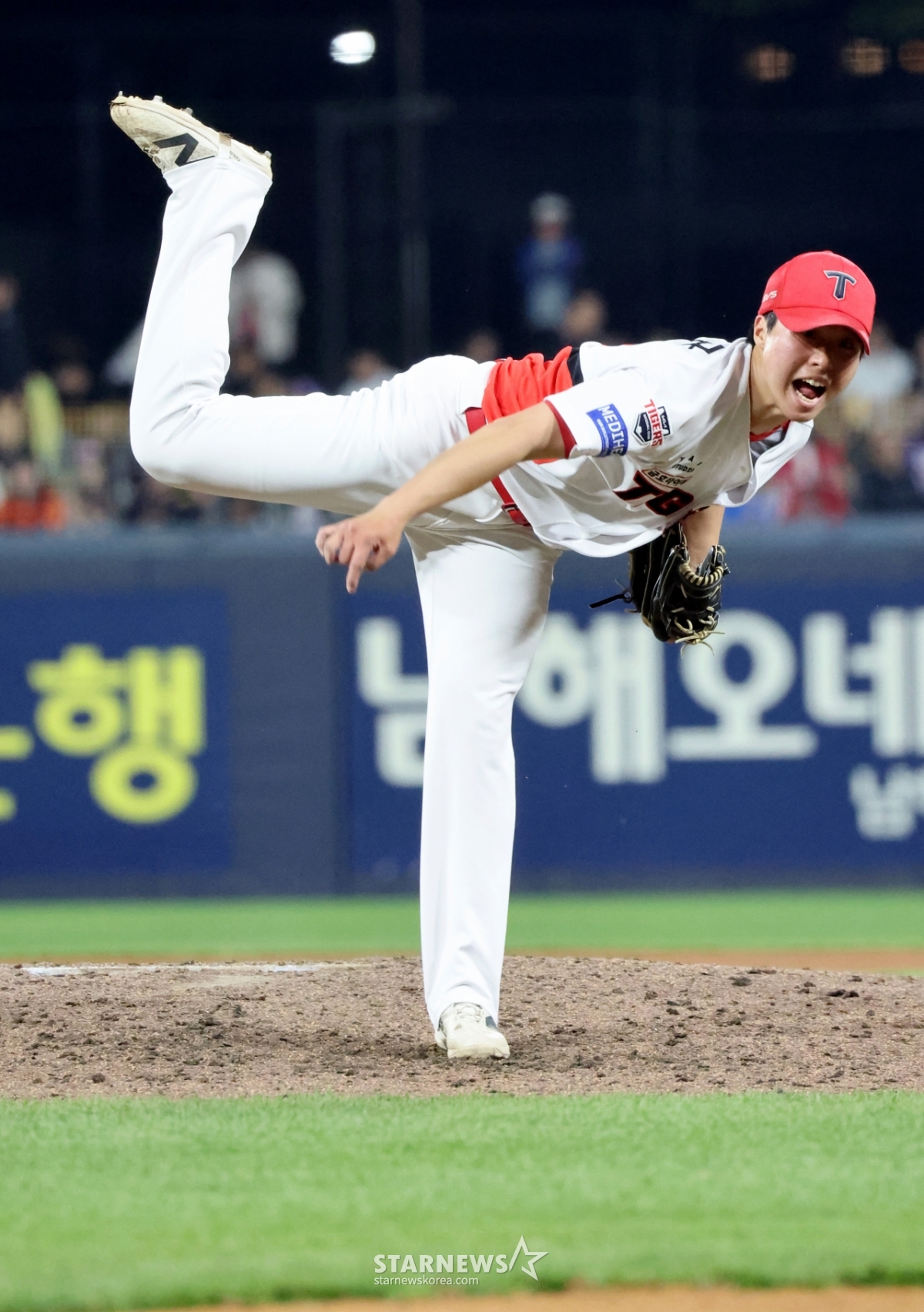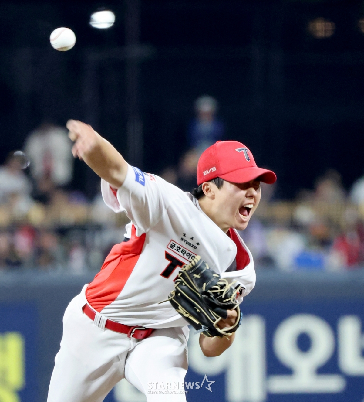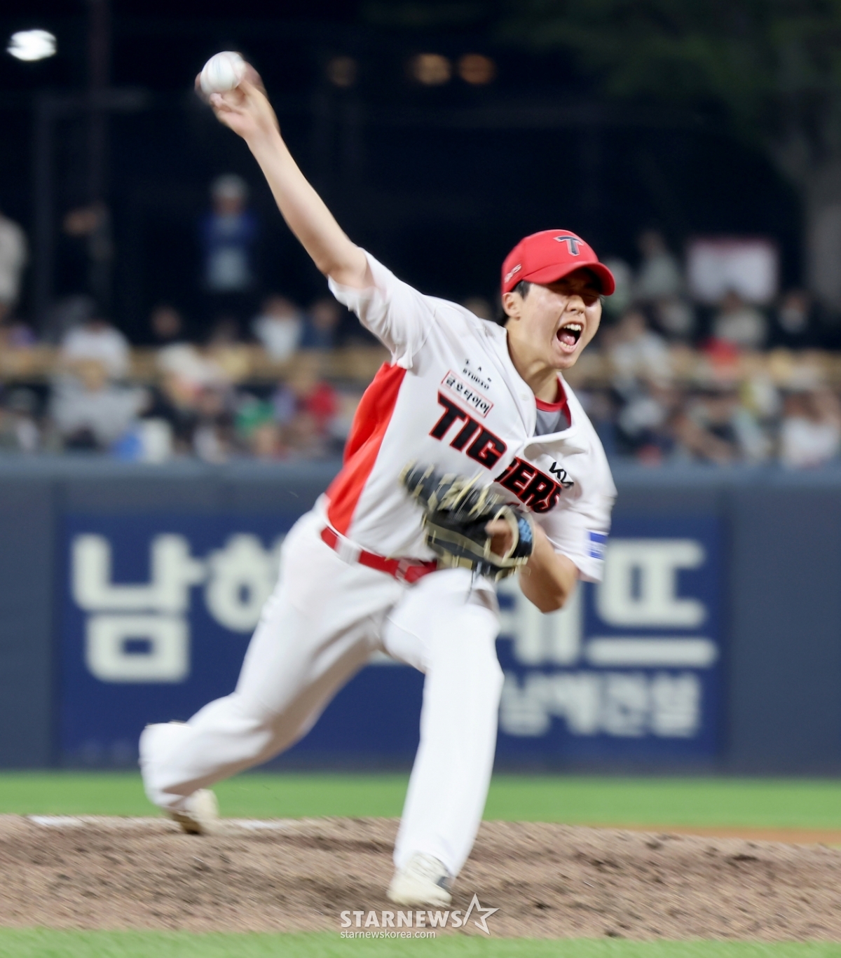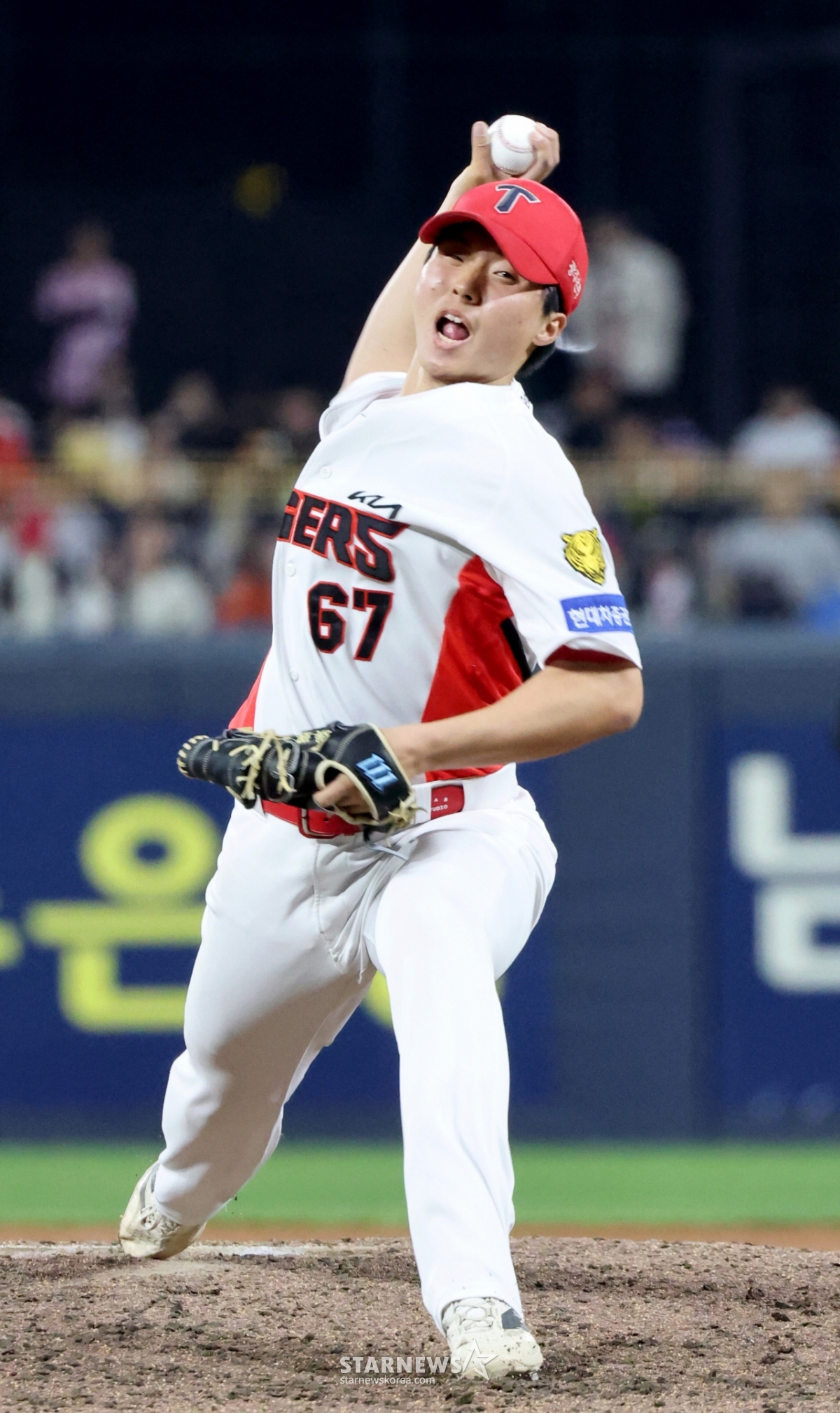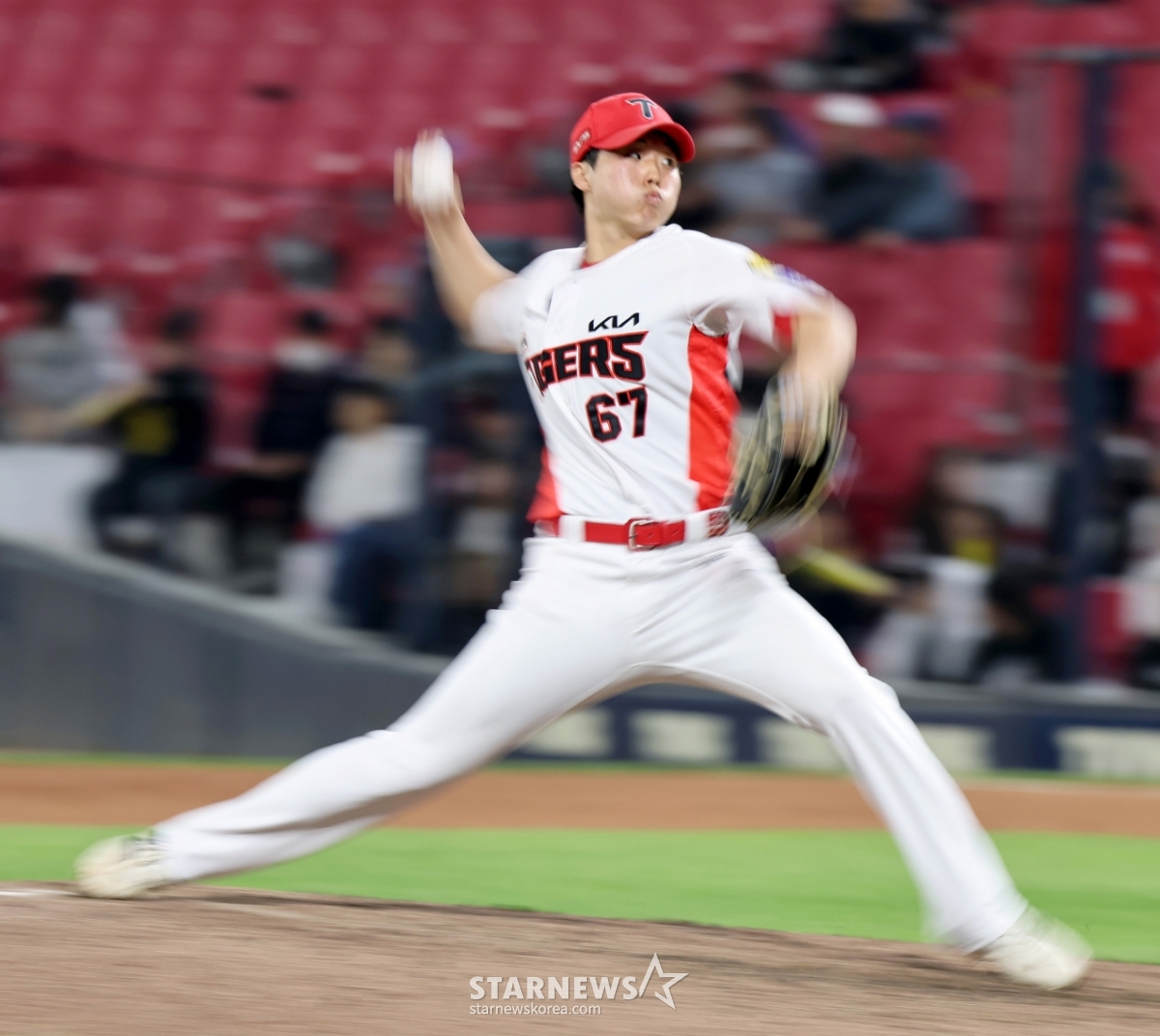 Hong Min-gyu, một cầu thủ ném bóng thuận tay phải của Kia Tigerers và Kirum Heroes tại Giải bóng đá vô địch KIA Gwangju vào ngày 16 và đang ném bóng không mất điểm sau khi xuất hiện ở đầu hiệp thứ sáu của trận đấu. 2026.04.16.