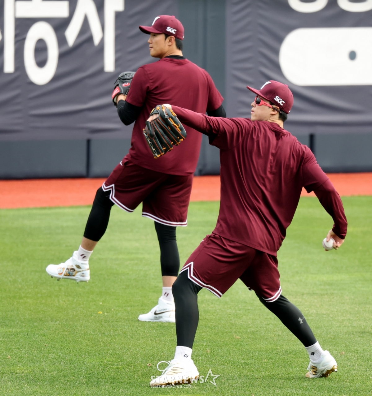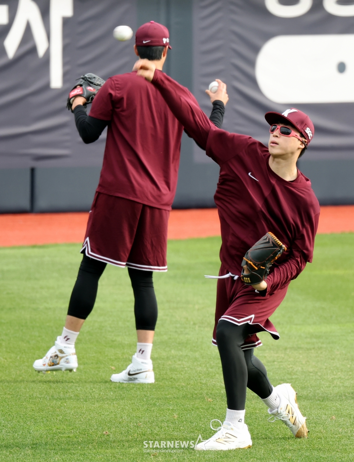 Cầu thủ ném bóng thuận tay phải Bae Dong-hyun của Kirum đang đứng song song với Ahn Woo-jin trước trận đấu giữa KT Wiz và Kirum Heroes của giải đấu 2026 KBO được tổ chức tại Công viên Suwon KT Wiz vào ngày 17.