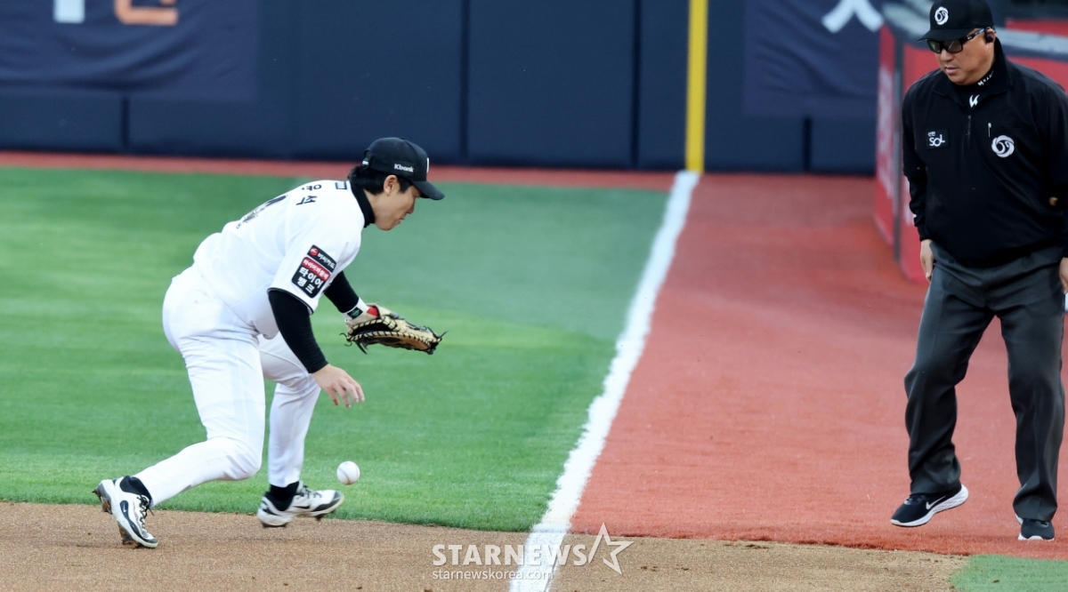 Cầu thủ chốt gôn 1 của KT Oh Yoon Suk đã không thể bắt được cú đánh bóng của Park Joo Hong ở đầu hiệp 1 của trận đấu giữa KT Wiz và Kirum Heroes diễn ra tại Công viên Suwon KT Wiz vào ngày 17. 2026.04.17.