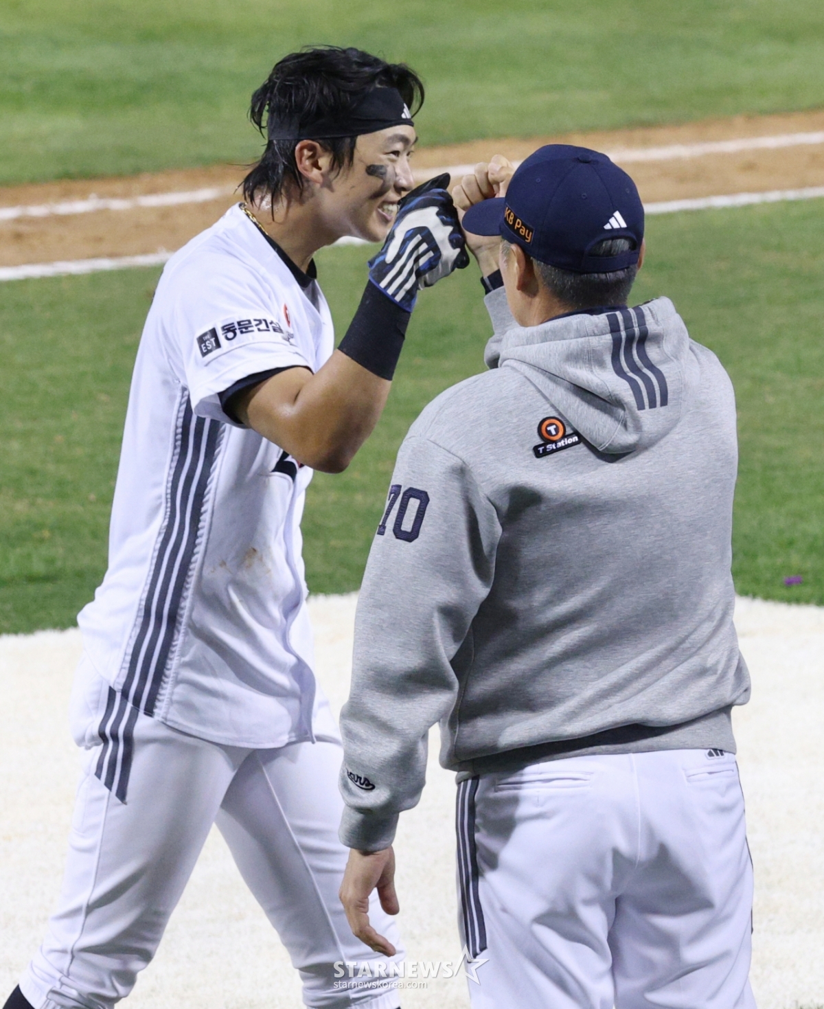 Kim Min Seok của Doosan đang nhận được sự hoan nghênh của huấn luyện viên Kim Won Hyung sau chiến thắng kịch tính ở cuối hiệp 10.