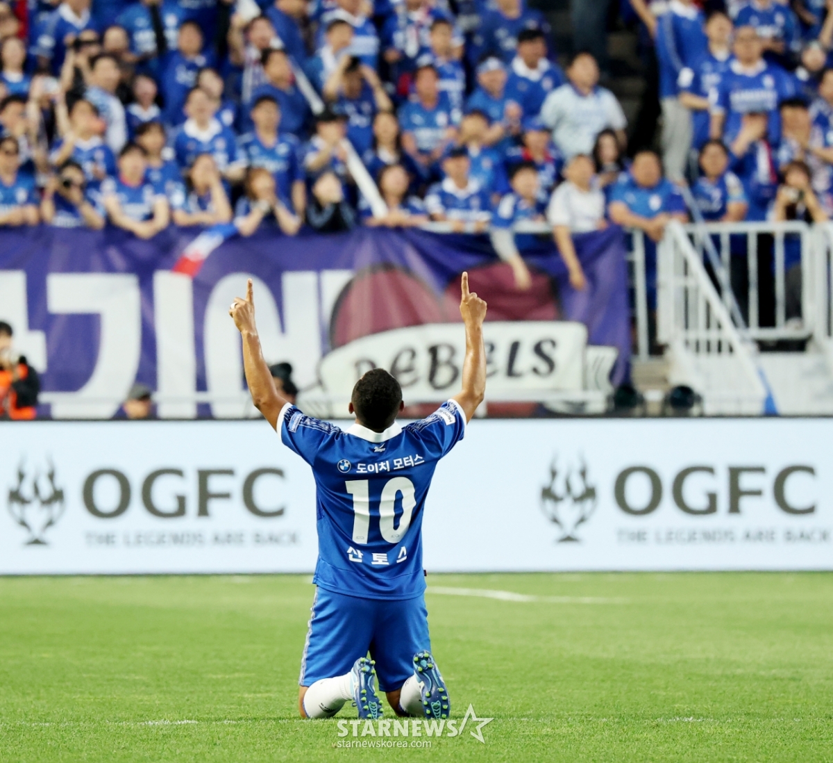 Suwon Samsung Legend Santos đang tận hưởng niềm vui cùng các đồng nghiệp sau khi ghi bàn thắng đầu tiên trong trận đấu huyền thoại giữa Suwon Samsung và OGFC được tổ chức tại sân vận động World Cup Suwon vào ngày 19. 2026.04.19.