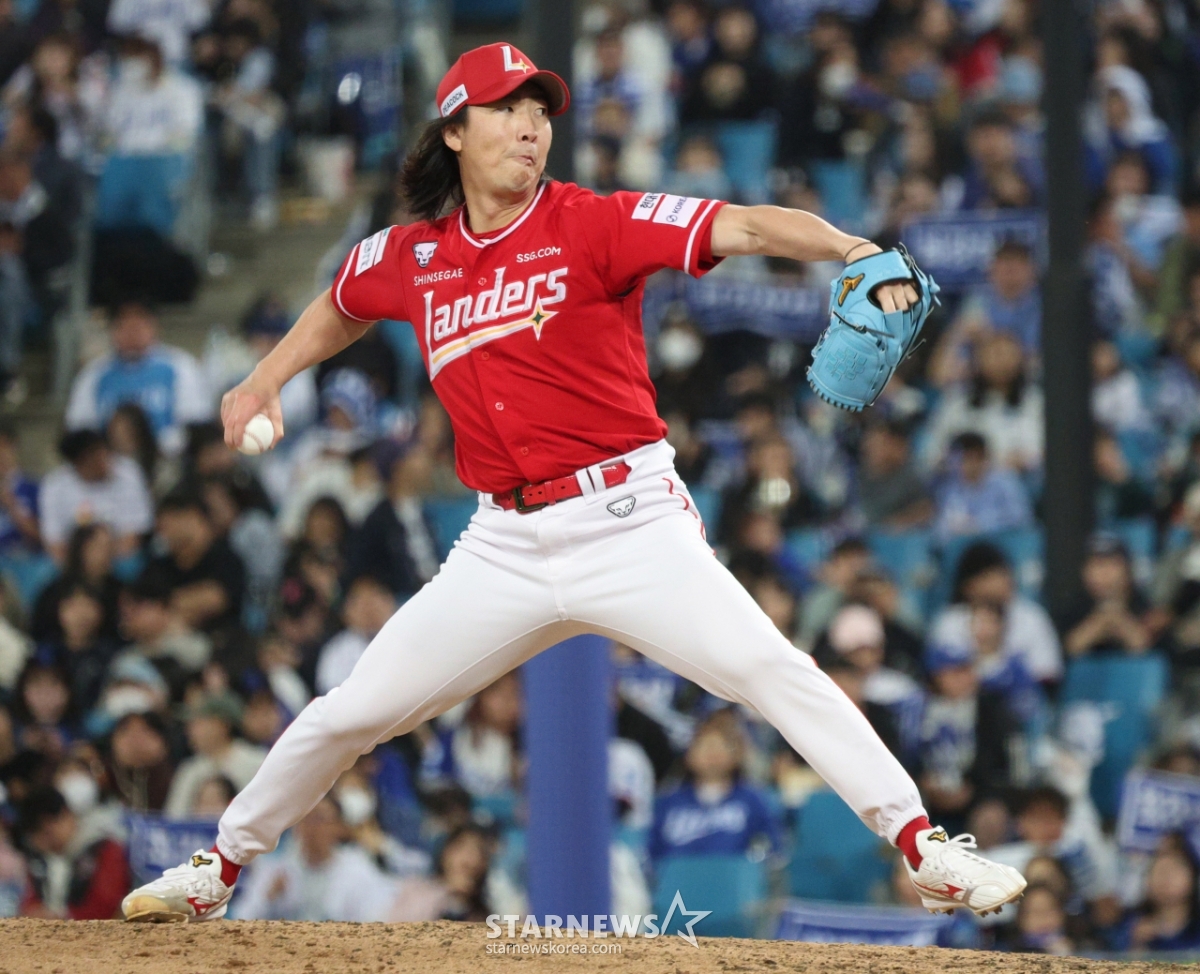 Moon Seung-won của SSG đang ném bóng ngược lại.