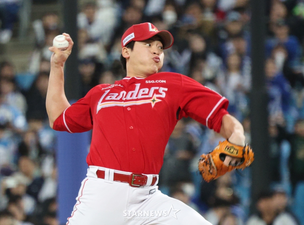 Cho Byung Hyun của SSG đang ném bóng ngược lại.