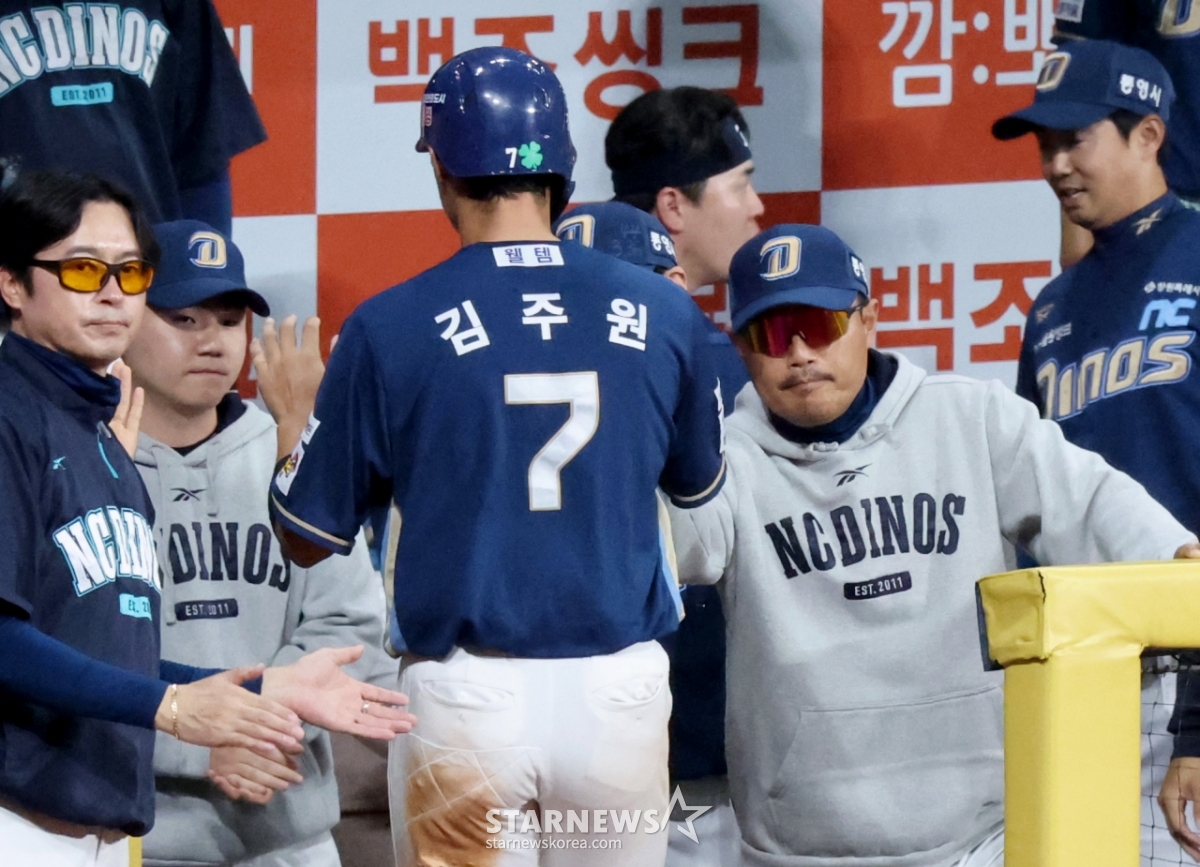 Kim Joo-won, người đánh bóng thứ hai của NC, đang nhận được lời chúc mừng của huấn luyện viên Lee Ho-joon sau khi ghi bàn gỡ hòa trong trận đấu đầu hiệp 5 giữa Kium Hero và NC Dinos ở Gocheok Sky Dome vào ngày 21. 2026.04.21.