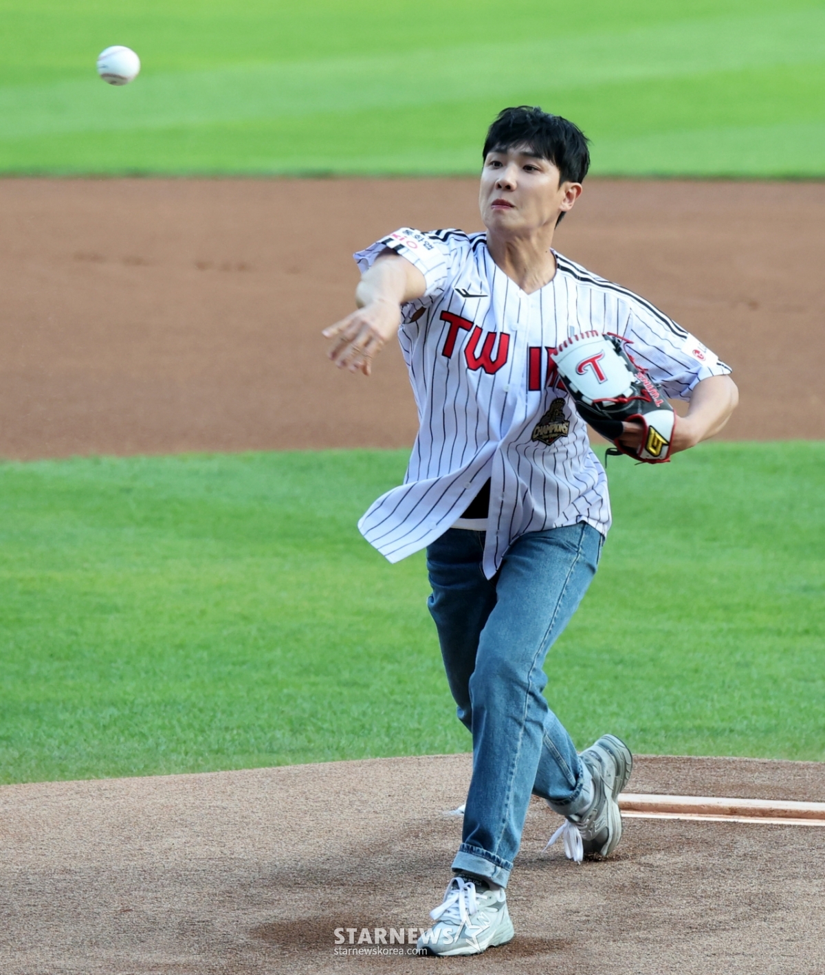 Diễn viên Lee Jun đang ném bóng khai mạc trận đấu giữa LG Twins và Hanwha Eagle trong giải đấu 2026 KBO League được tổ chức tại sân bóng chày Jamsil vào ngày 22. Lee Jun, người đã ném bóng mở màn, không thể ngẩng mặt lên được. 2026.04.22.