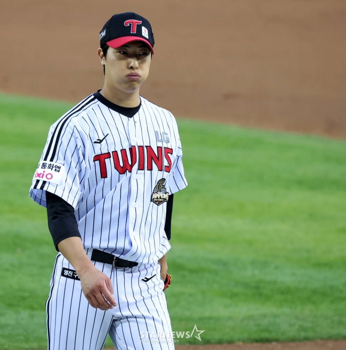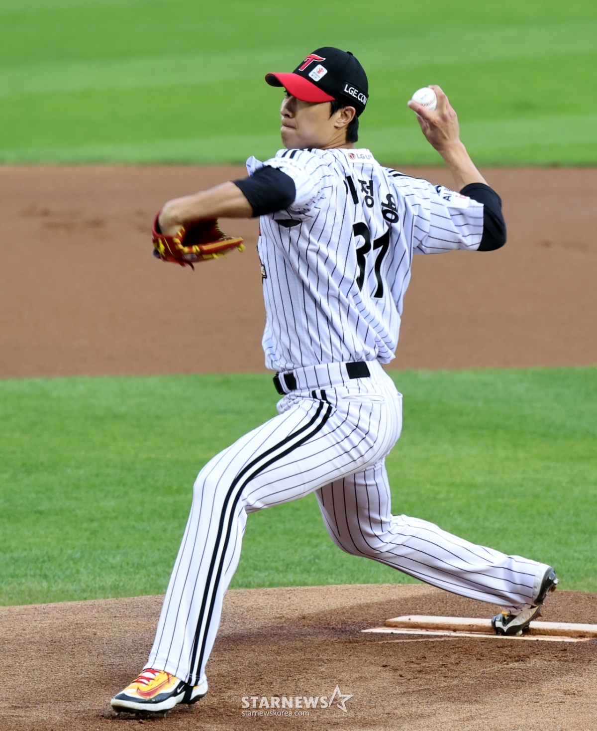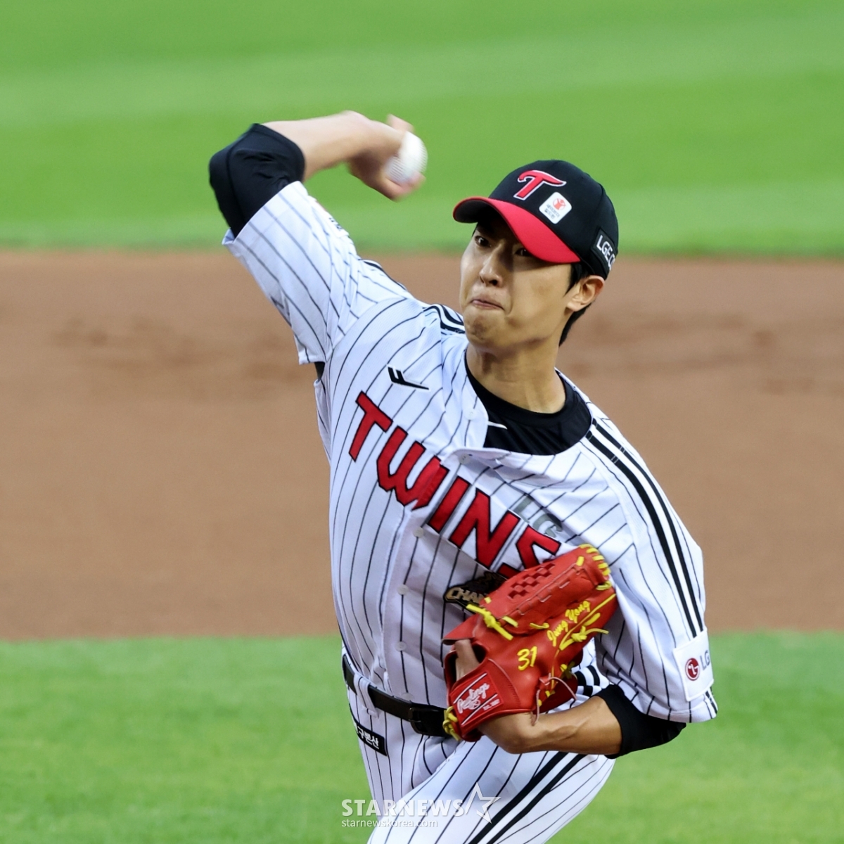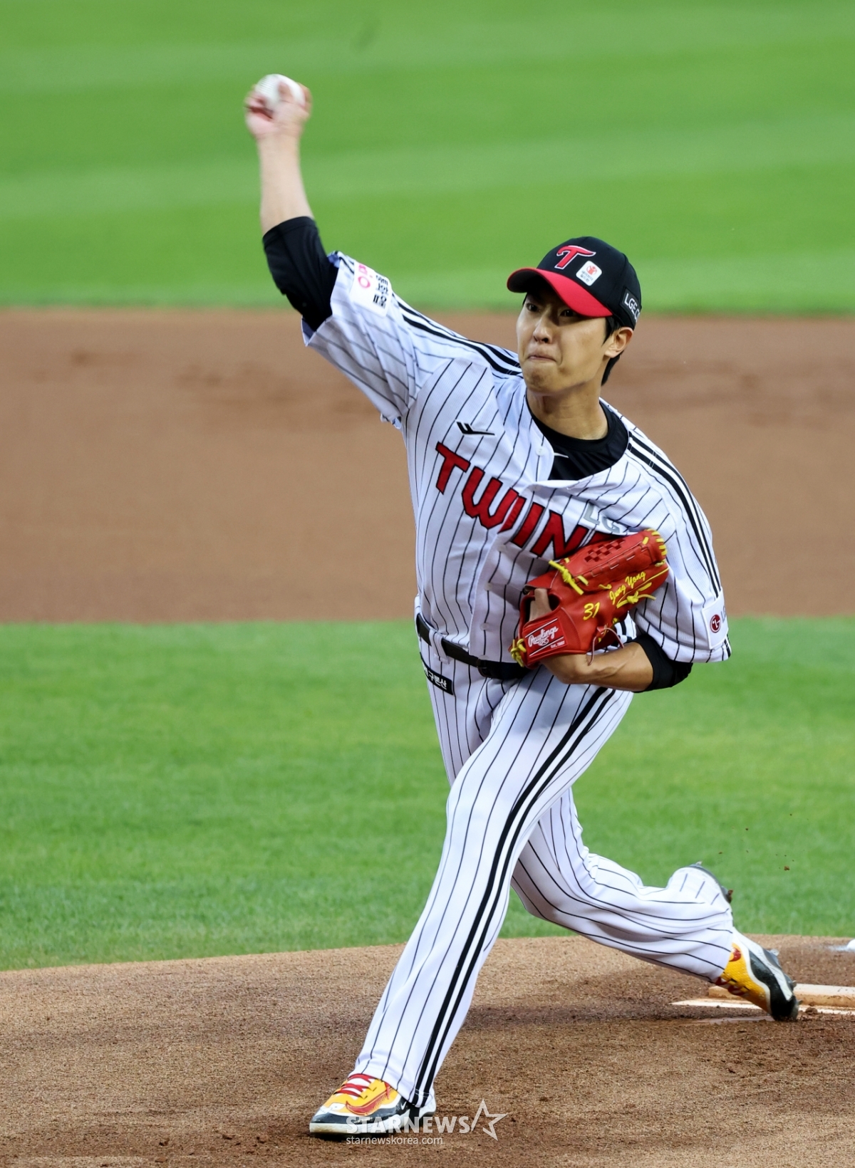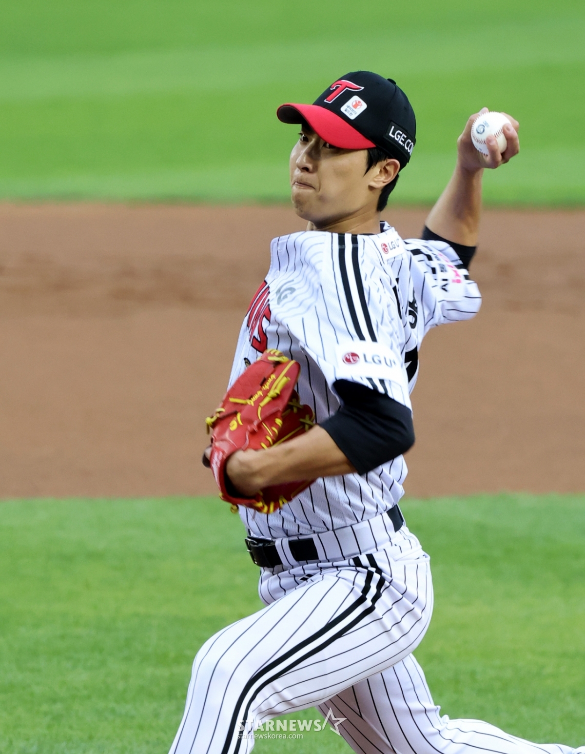 Cầu thủ ném bóng thuận tay phải Lee Jung Yong của 1LG đang ném bóng ngược lại trong trận đấu giữa LG Twins và Hanwha Eagle tại sân bóng chày Jamsil vào ngày 23. 2026.04.23.