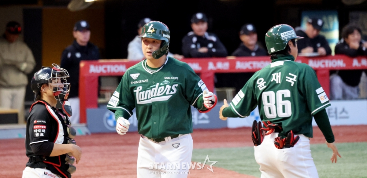 Choi Jung, người đánh bóng thứ ba của Landers, là người đánh bóng hàng đầu ở cuối hiệp 3 của trận đấu giữa SSGlanders và KT Wiz được tổ chức tại Landersfield vào ngày 24, sau khi đánh một cú home run solo trước Boschley. 2026.04.24.