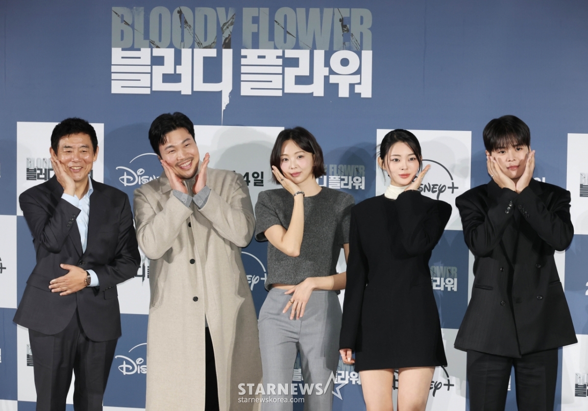 Sáng 27/3, diễn viên Sung Dong Il, Shin Seung Hwan, Geum Sae Rok, Jung Sori, Ryeo Woon đang tạo dáng tại buổi họp báo ra mắt bộ phim gốc của Disney+ được tổ chức tại CGV Yongsan IPark Mall, Seoul.