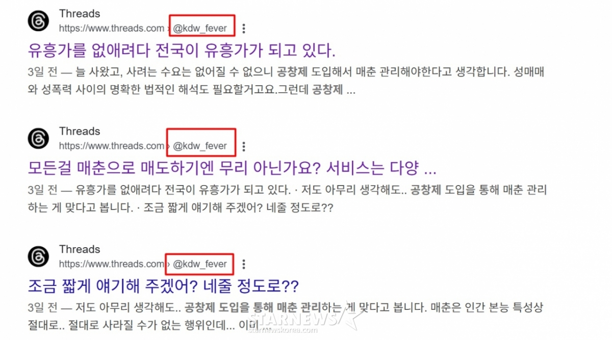 Bài viết tuyên bố hợp pháp hóa mại dâm của Kim Dong Wan đã bị xóa khi anh ta đóng tài khoản thread, nhưng vẫn để lại dấu vết đó trên Google.