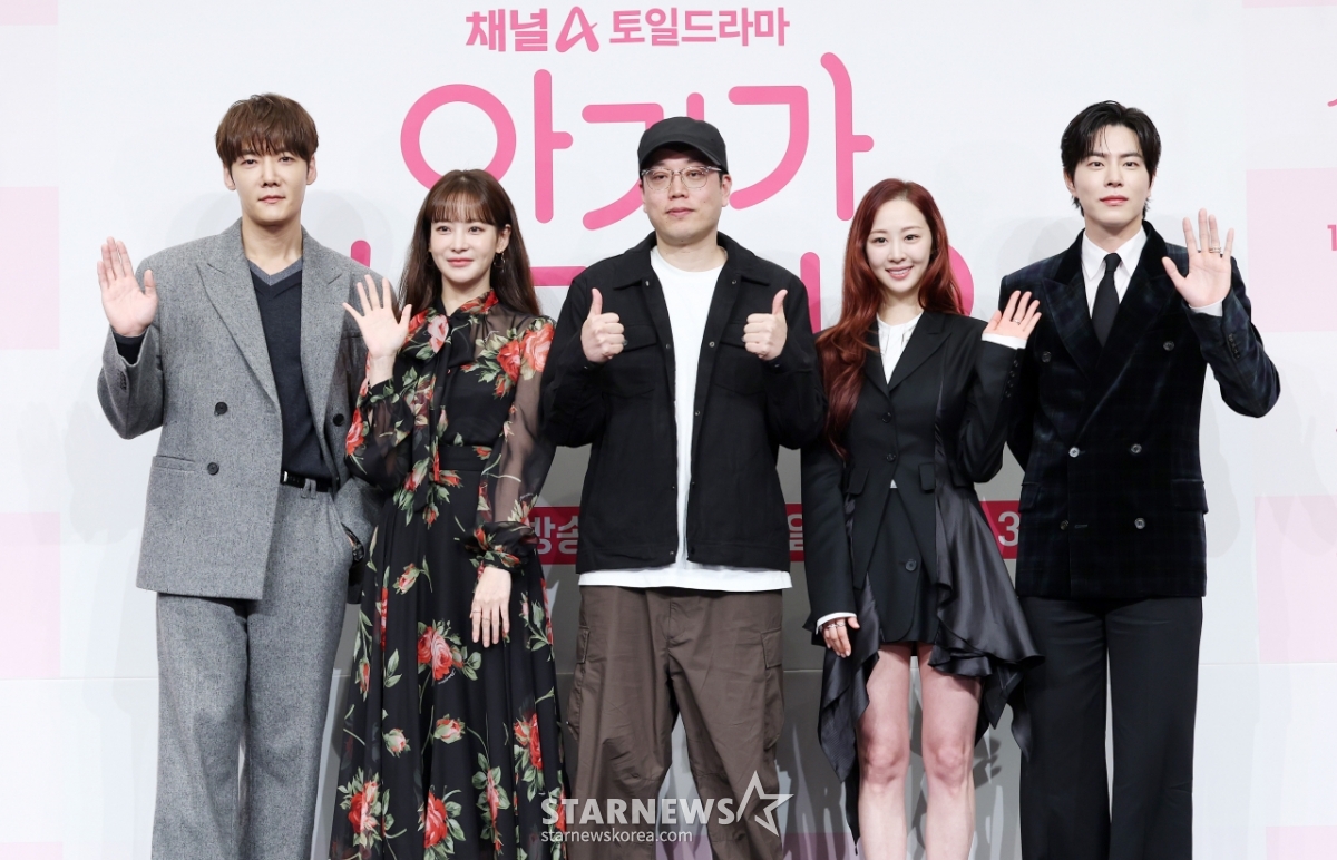 演员崔振赫、吴妍书、金镇成导演、演员洪钟贤、金多顺13日出席了在首尔九老区The Link酒店举行的频道A土日剧《有了孩子》的制作发布会,并摆出造型,供记者们拍照。 /2026.01.13