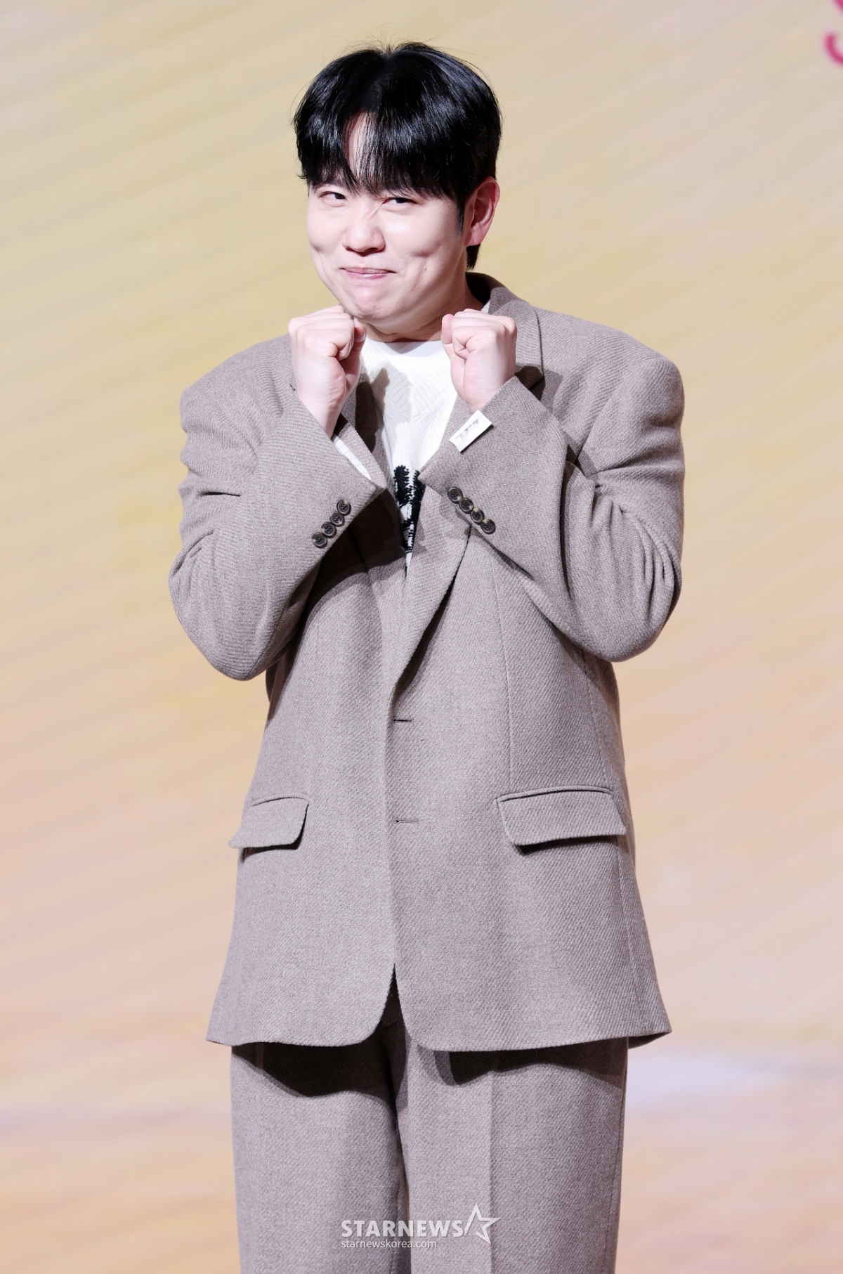 歌手韩海14日出席了在首尔麻浦区酒店渡口举行的奈飞综艺节目《松之屋第五季》的制作发布会,并摆出造型,供记者们拍照。 /2026.01.14