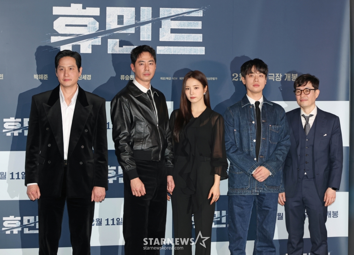 演员朴海俊、赵寅成、申世京、朴正民、柳承莞导演4日下午参加了在首尔CGV龙山IPARK购物中心举行的电影《Humint》(导演柳承莞)媒体发行试映会及记者招待会。 /2026.02.04