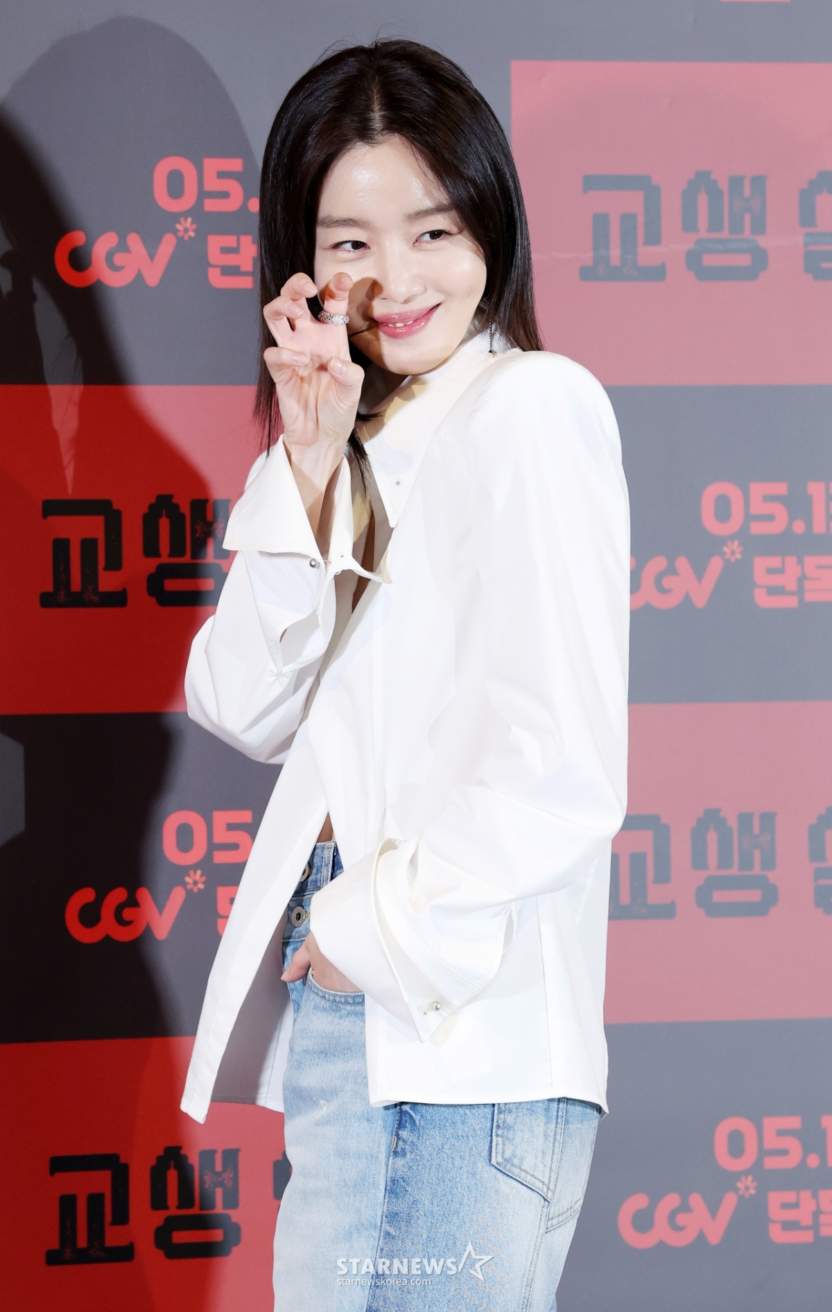 29日,演员韩善华在首尔龙山区CGV Ipark购物中心举行的电影《实习生》媒体试映会及记者见面会上摆出造型,供记者们拍照。 /2026.04.29