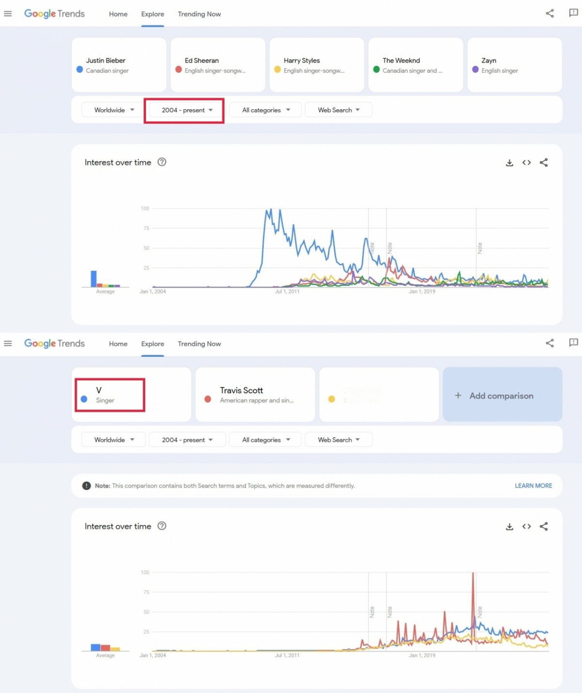 V从防弹少年团出道日的2013年6月13日到2026年1月30日,在谷歌创下了较高的搜索量,证明了作为K-POP代表人物的存在感。 2021年、2022年、2024年、2025年谷歌趋势也创下了全亚洲明星搜索量之最。