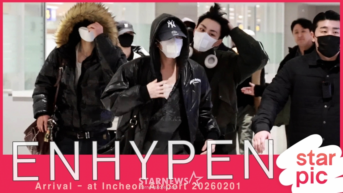 *此内容由AI翻译生成。组合ENHYPEN成员、善宇、熙胜、Jake、成勋、J、Nicky结束香港日程后,于1日上午通过仁川国际机场入境。 2026.02.01© STARNEWS. 未经许可禁止转载或再分发*此内容由AI翻译生成。