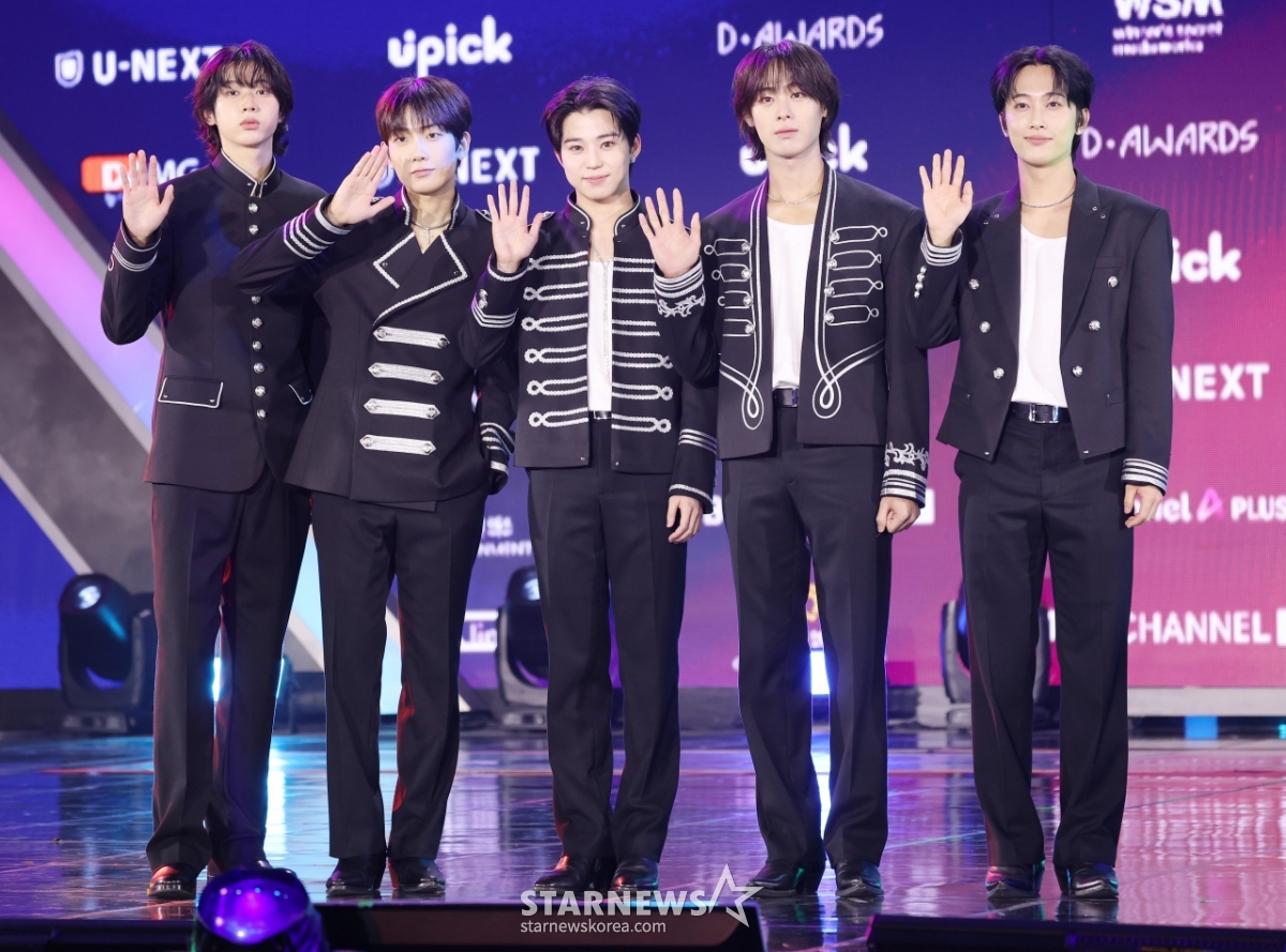 *此内容由AI翻译生成。组合Hi-Fi独角兽11日出席在首尔城北区高丽大学花井体育馆举行的"第二届颁奖典礼"红地毯照片墙,并摆出造型,供记者们拍照。 /2026.02.11© STARNEWS. 未经许可禁止转载或再分发*此内容由AI翻译生成。