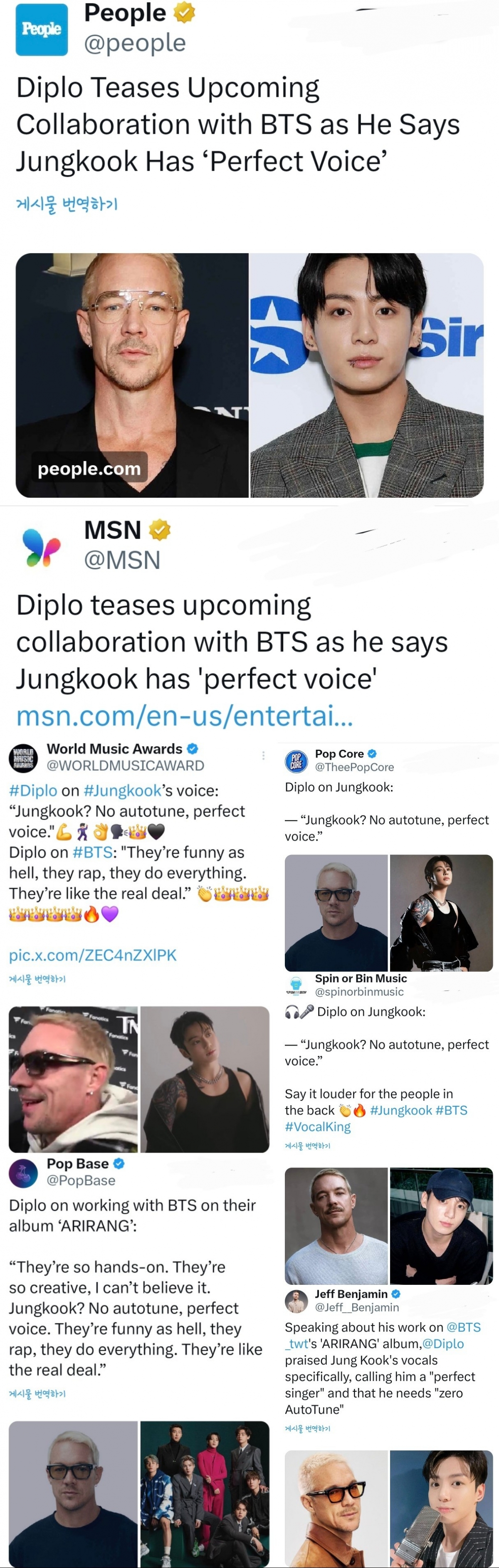 Diplo在接受美国演艺媒体TMZ采访时谈到了防弹少年团回归专辑《ARIRANG》的制作,并写道:"정国? 不需要自动调音程序。 拥有完美的嗓音。" 对此在社交媒体"X"上成为了话题。