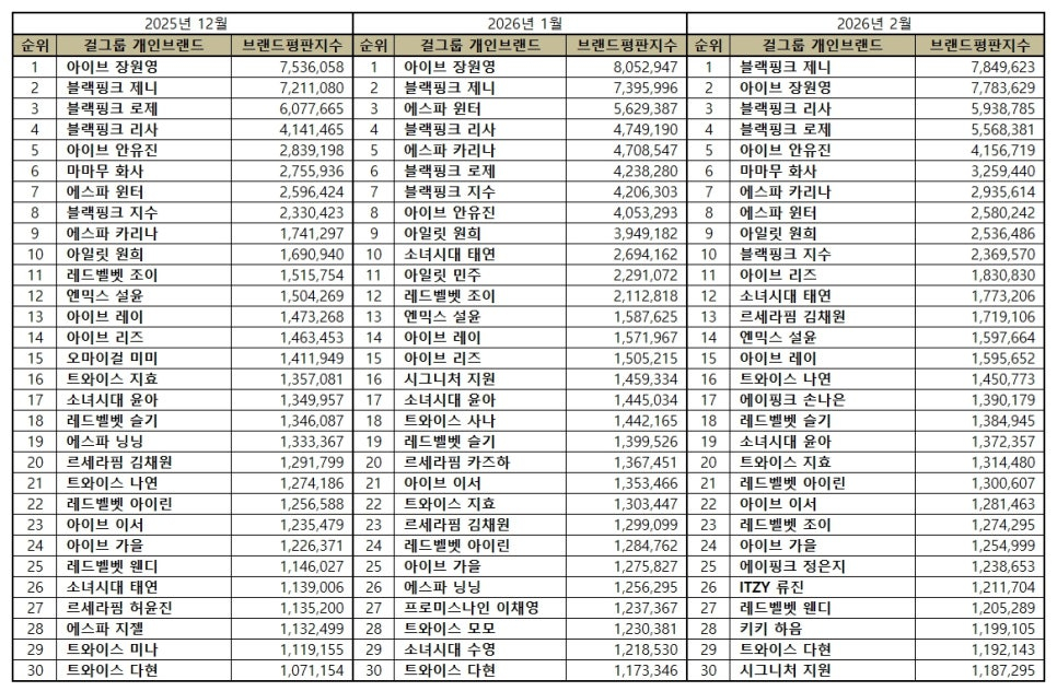 韩国企业评价研究所为了分析女子组合个人品牌评价2026年2月的大数据,从2026年1月15日到2026年2月15日,提取了730名女子组合个人的品牌大数据115,821,066个,以消费者对女子组合个人品牌的行动分析,以参与指数、媒体指数、沟通指数、社区指数分析了品牌评价指数。 与今年1月女子组合个人品牌124,777,662个大数据相比,减少了7.18%。