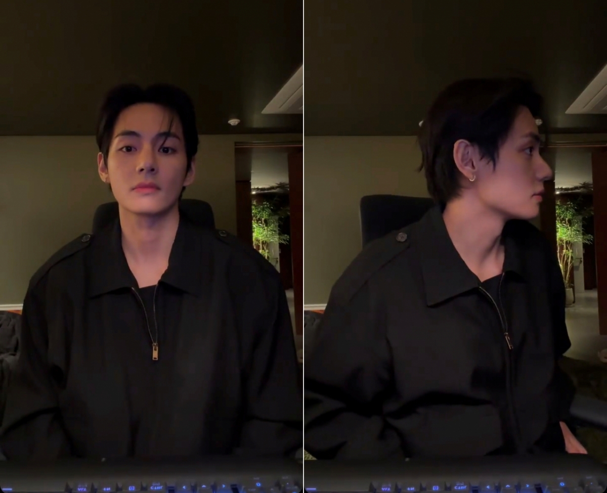 V身穿干练的黑色套装登场。 他恢复到让人想不起服兵役当时肌肉发达的身材,开始着手准备回归的管理。