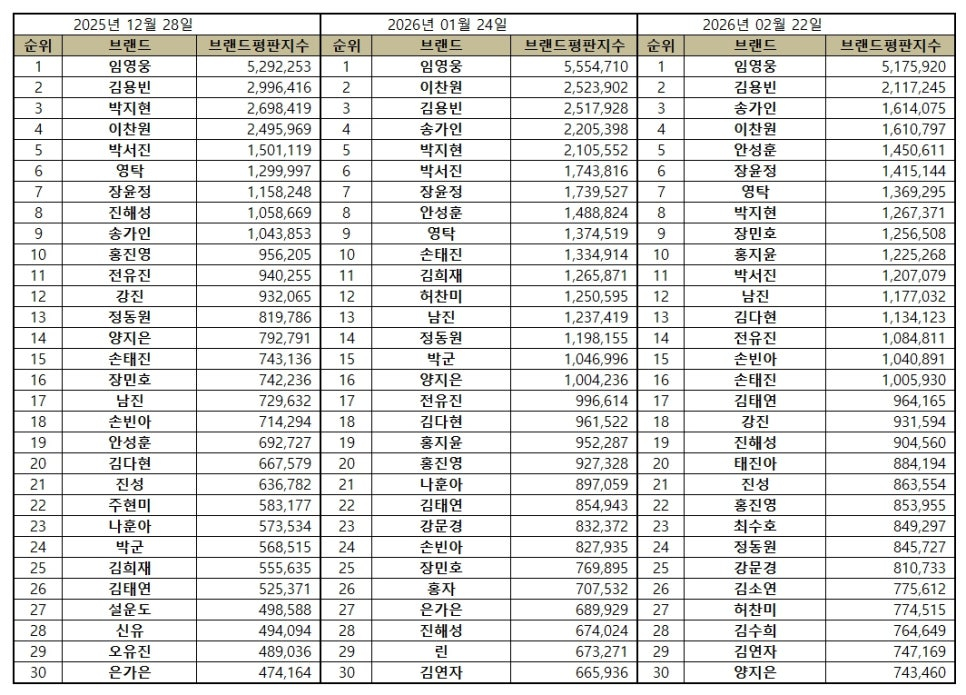 2026年2月韩国演歌歌手品牌评价前30位的顺序是林英雄、金勇彬、宋歌人、李灿元、安成勋、张润贞、英卓、朴智贤、张民皓、洪智允、朴瑞镇、南镇、金多贤、全宥珍、孙彬雅、孙泰镇、泰珍、陈成、洪真英、崔秀浩、郑东元、姜文京、金素妍、金秀熙、金妍、金妍子、杨智恩智分析。