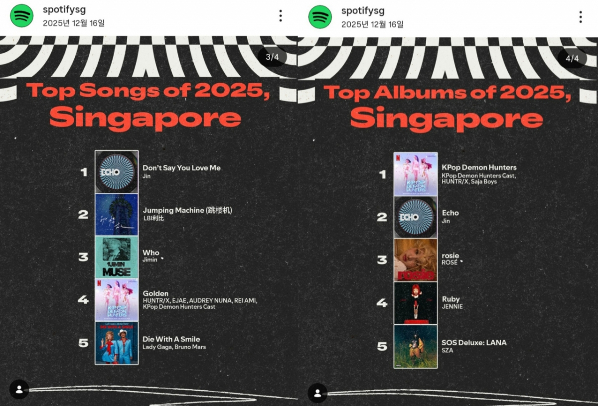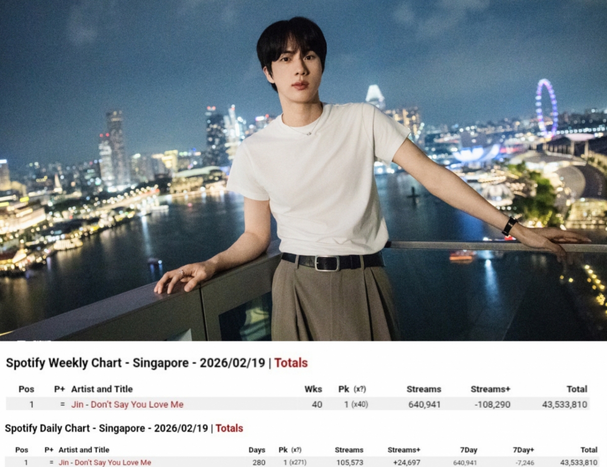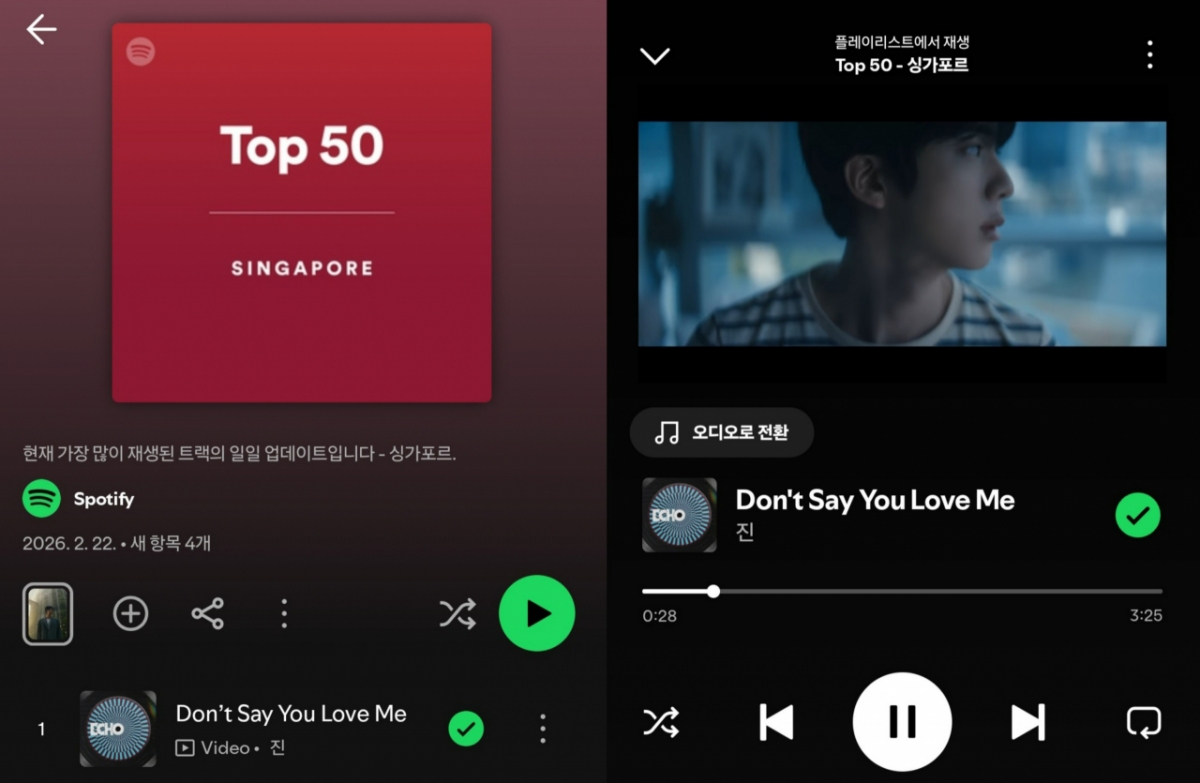 防弹少年团(BTS)JIN在Spotify新加坡排行榜上展示了独一无二的音源力量。
