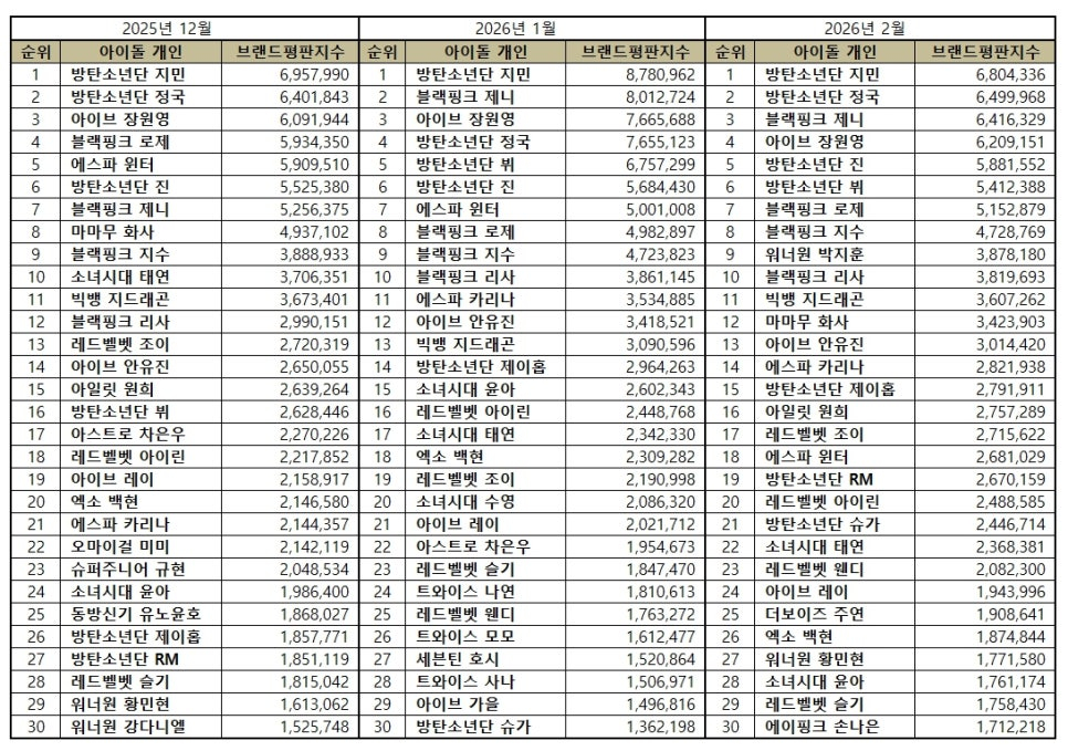2026年2月偶像个人品牌评价前30位是防弹少年团智旻、防弹少年团 정국国、BLACKPINK JENNY、IVE张元英、防弹少年团JIN、BLACKPINK智秀、Wanna One朴志训、BLACKPINK LISA、BigBigBang GD、MAMOO华莎、IVE、IVE WINTHINTHER、BTS RE、RED VELINGER、RED SUETHINGER、RENTHY、THING