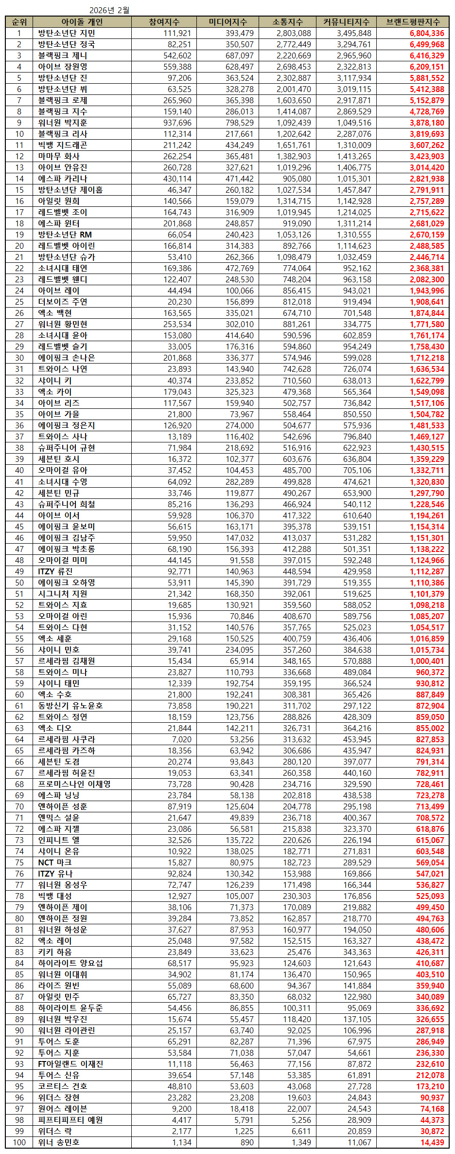 2026年2月偶像个人品牌评价前100名是防弹少年团智旻、防弹少年团 정국国、BLACKPINK JENNY、IVE张元英、防弹少年团JIN、BLACKPINK智秀、Wanna One朴志训、BLACKPINK LISA、BigBigBang GD、MAMOO华莎、IVE、IVE WINTHINTHER、BTS RE、RED VELINGER、RED SUETHINGER、RENTHINGER、TY Apink郑恩地、TWICE Sana、Super Junior圭贤、Seventeen Hoshi、OH MY GIRL刘亚、少女时代秀英、Seventeen珉奎、Super Junior希澈、Ipink金南珠、Apink Mimi、ITZY柳真、Apink吴夏荣、Signature支援、TWICE多贤、EXO世勋、SHINee旻浩、L SHORAPIM、L金彩元、L金彩元、SHINGERFIM、SHING NCT Mark、ITZY有娜、Wanna One邕圣祐、Bigbang大成、Enhype Jay、Enhype Jungwon、Wanna One Hyeon、Highlight Min、Highlight尹斗俊、Wanna One朴佑镇、Wanna One赖冠霖、Tours道勋、FTISLAND李宰镇、Tours申有天、Cortisland李载镇、Why Gunhoon、We张贤、WeP.One Pi.Lock、