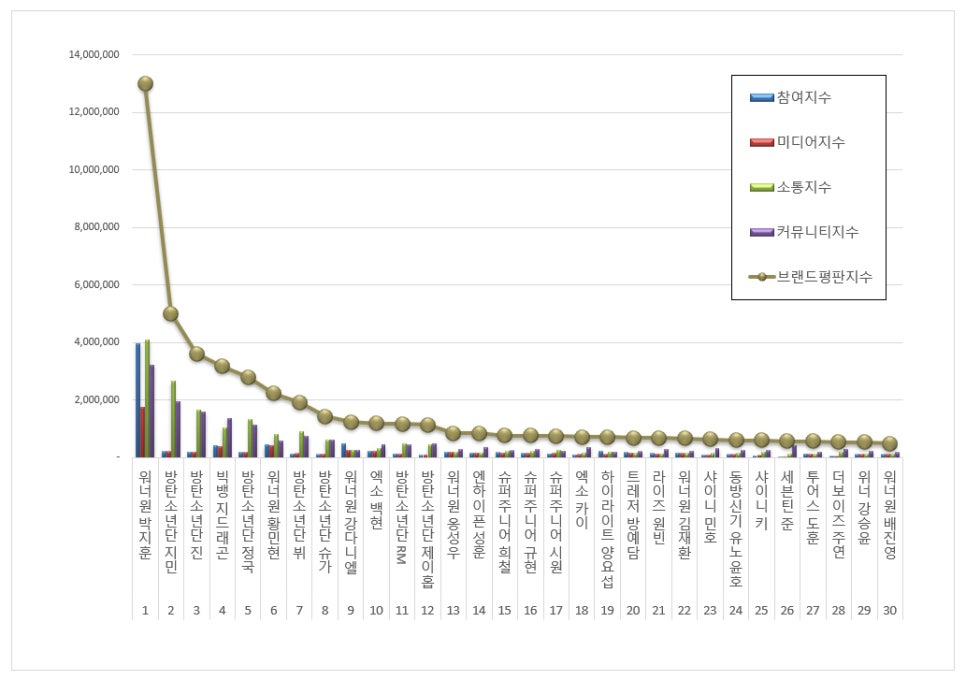 据分析,获得男子组合个人品牌评价第一名的Wanna One品牌的参与指数为3958781媒体指数为1732,406沟通指数为4,083,499社区指数为3,220,421,品牌评价指数为12,995,107。 与今年2月的品牌评价指数402420相比,上升了3129.24%。