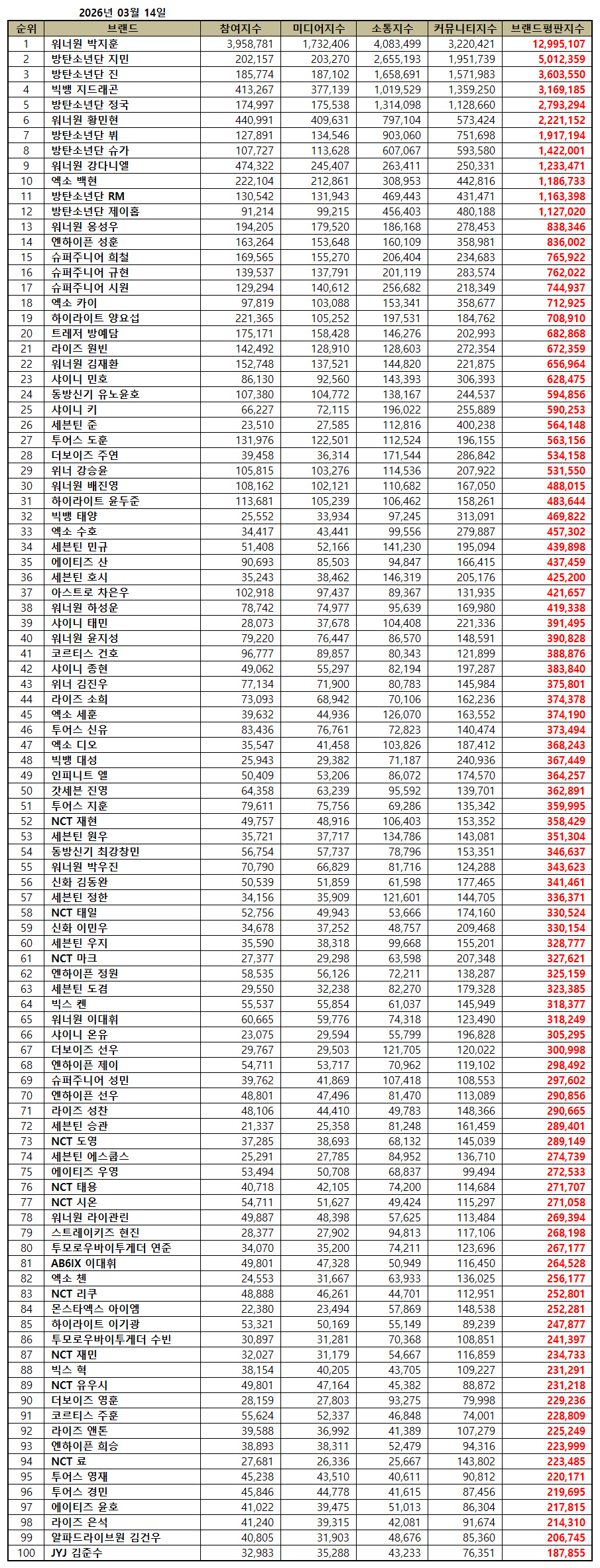 韩国企业评价研究所为了分析男子组合个人品牌评价大数据,从2026年2月14日到2026年3月14日,提取了71697396个男子组合个人品牌大数据,用消费者对男子组合个人品牌的行动分析,以参与指数、媒体指数、沟通指数、社区指数分析了品牌评价指数。 与今年2月男子组合品牌大数据65978643个相比,增加了8.67%。