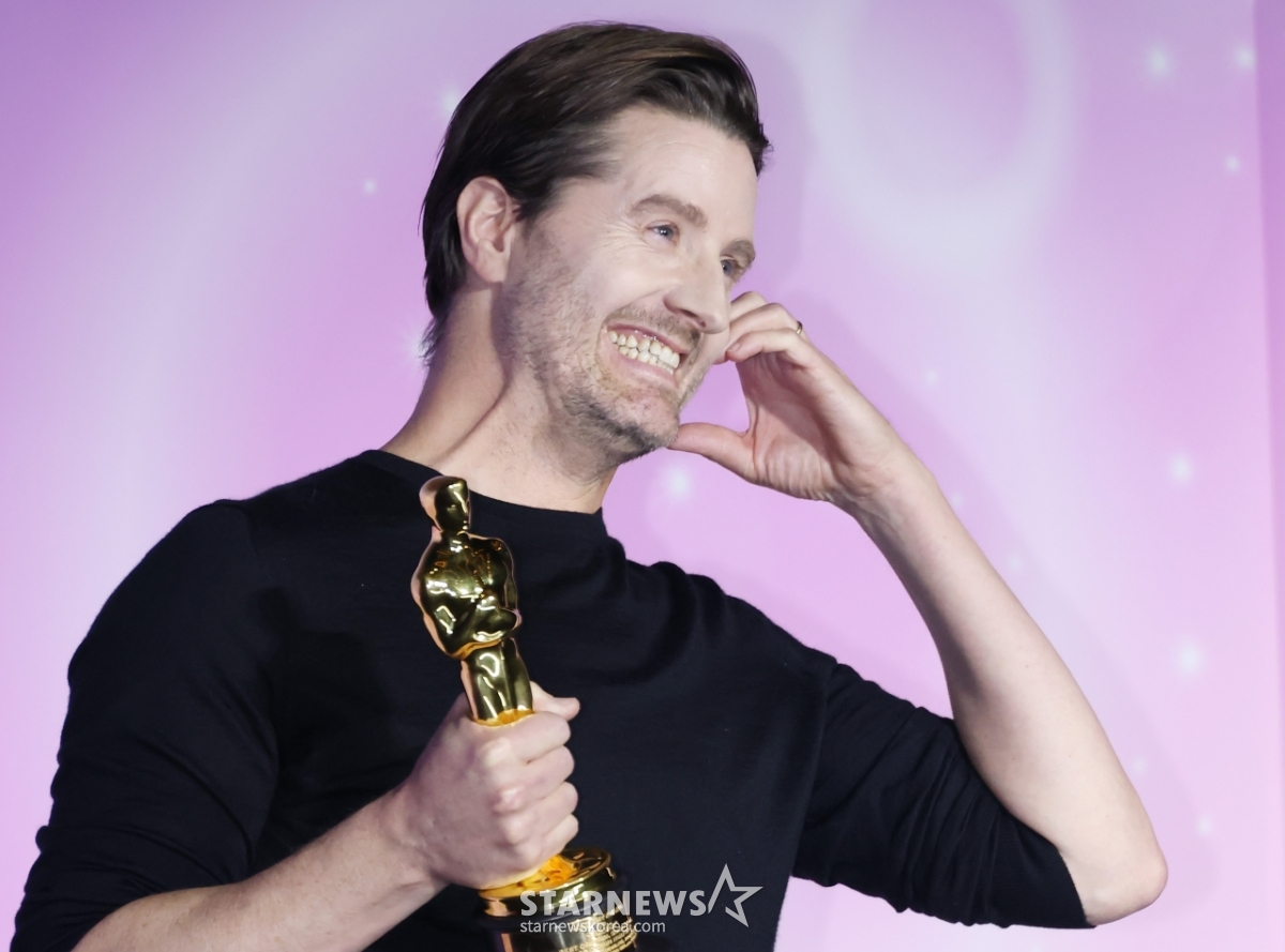 1日下午,在首尔CGV龙山IPARK购物中心举行的奈飞电影《K-POP守护者》奥斯卡获奖纪念记者会上,共同导演克里斯·阿普汉斯正摆出造型,供记者们拍照。 /2026.04.01