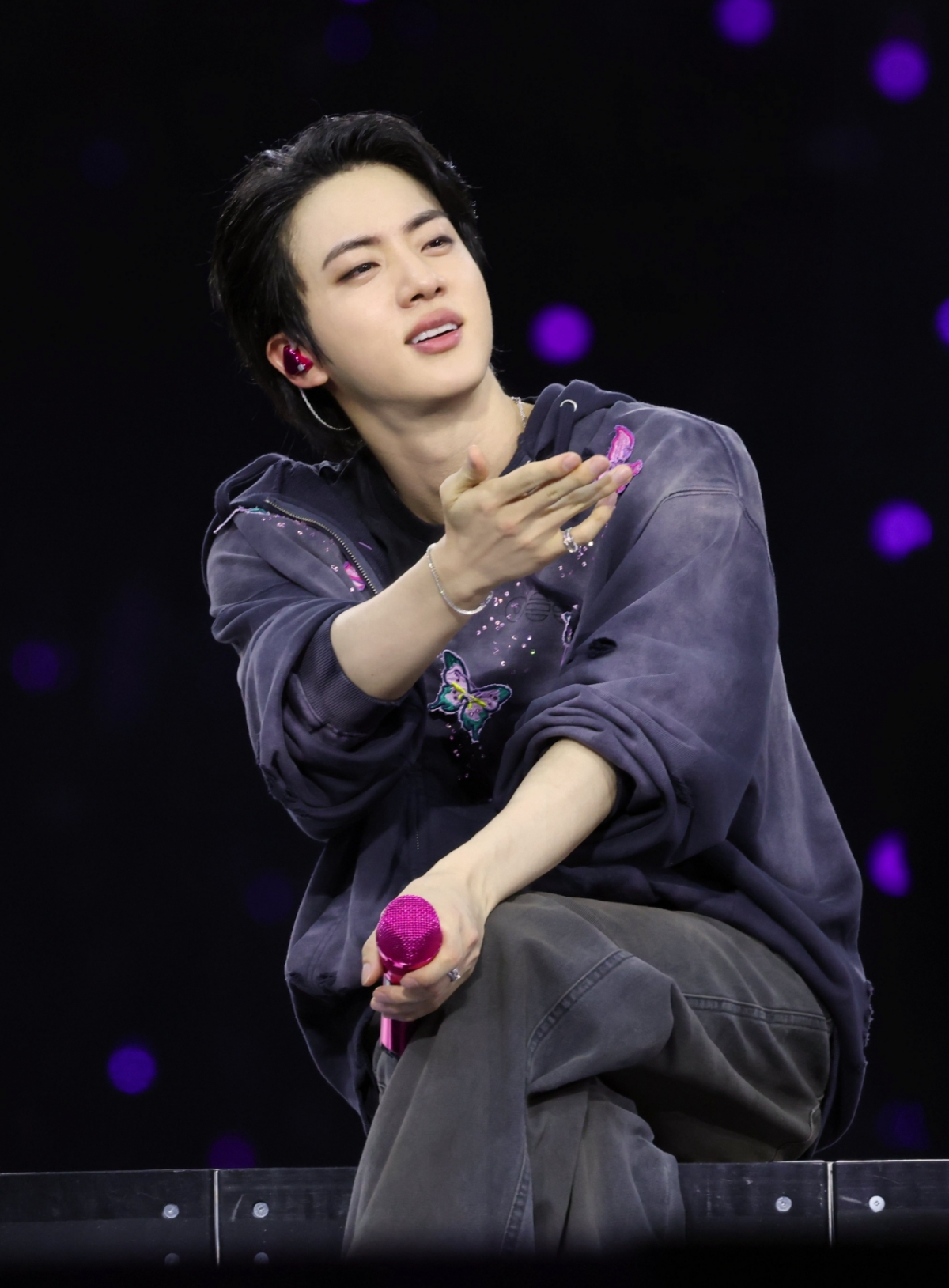 Jin所属的防弹少年团26日(韩国时间)在佛罗里达州坦帕雷蒙德詹姆斯体育场举行了阿里郎世界巡演(BTS WORLD TOUR'ARIRANG' IN TAMPA)的美国首场演出。