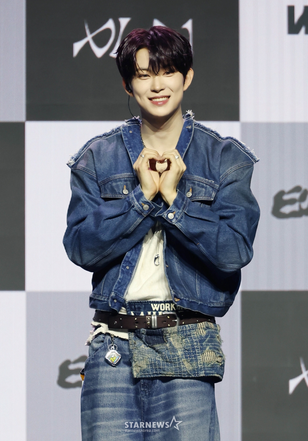 组合Alpha Drive One建宇12日下午在首尔龙山区Blue Square举行的迷你1辑《EUPHORIA》发行纪念表演秀上摆出造型,供记者们拍照。