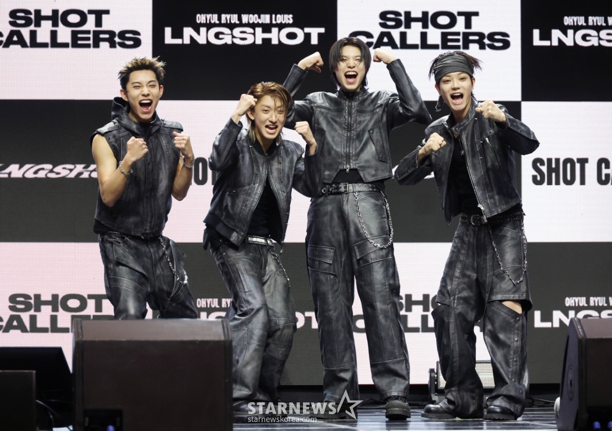 组合Longshot(吴律、律、佑镇、路易)13日下午在首尔永登浦区明花Live Hall举行的出道EP《SHOT CALLERS》发行纪念新歌发布会上摆出造型,供记者们拍照。