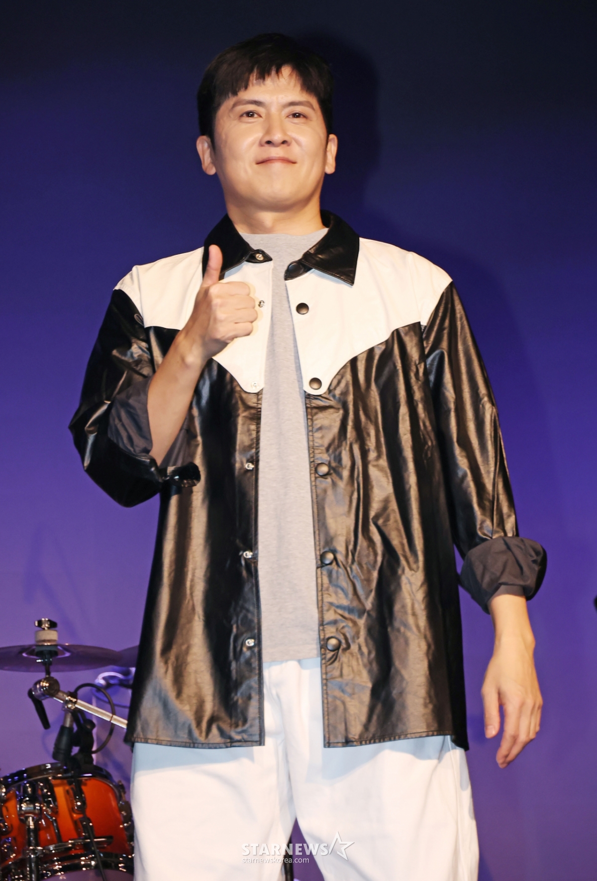 12日下午,在首尔钟路区SA Hall举行的首张数码单曲《你知道》发行纪念表演秀上,Umuta乐队队长兼贝斯手洪京民正摆出造型,供记者们拍照。