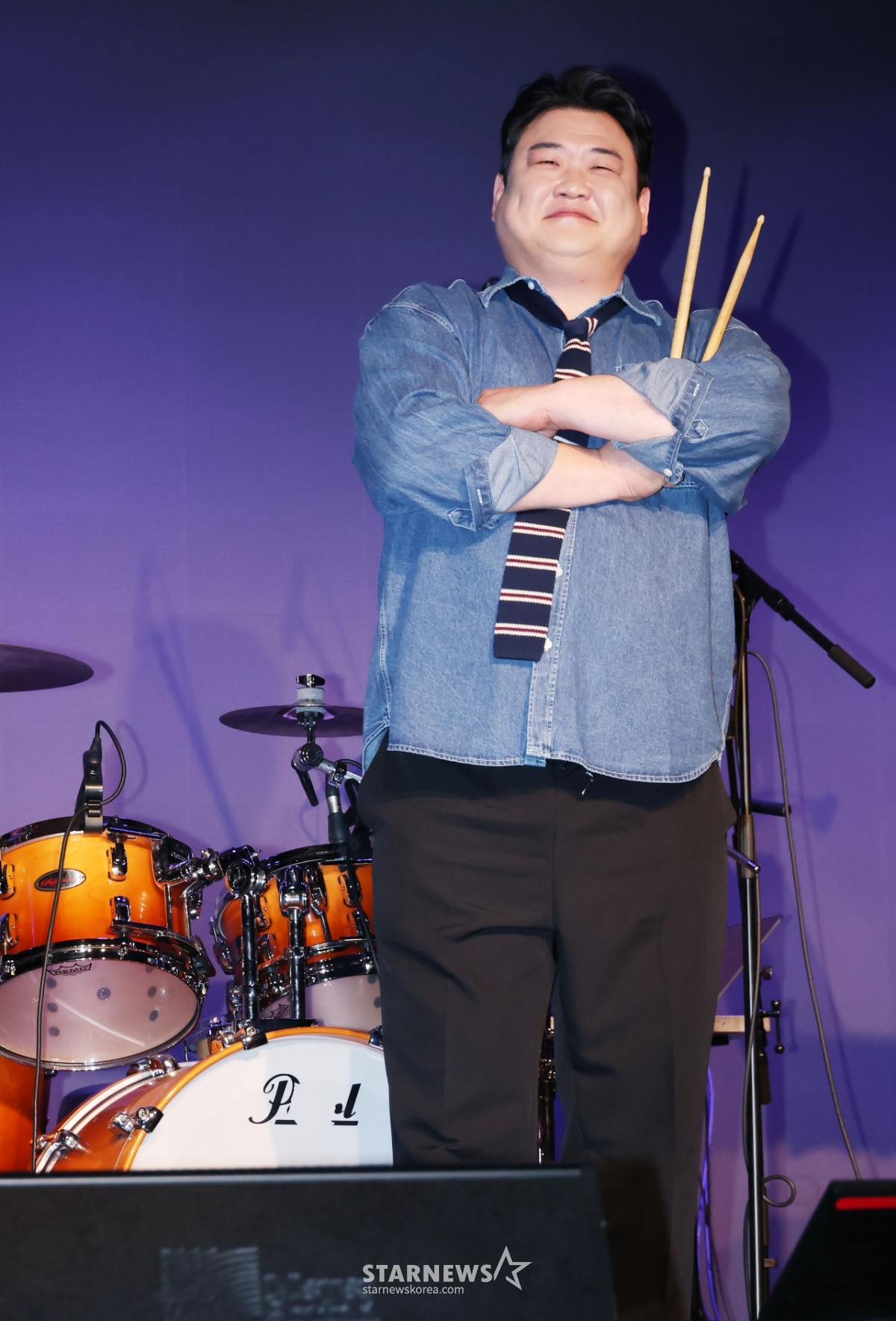 12日下午,在首尔钟路区SA Hall举行的首张数码单曲《你知道》发行纪念表演秀上,Umuda乐队鼓手金峻铉正摆出造型,供记者们拍照。