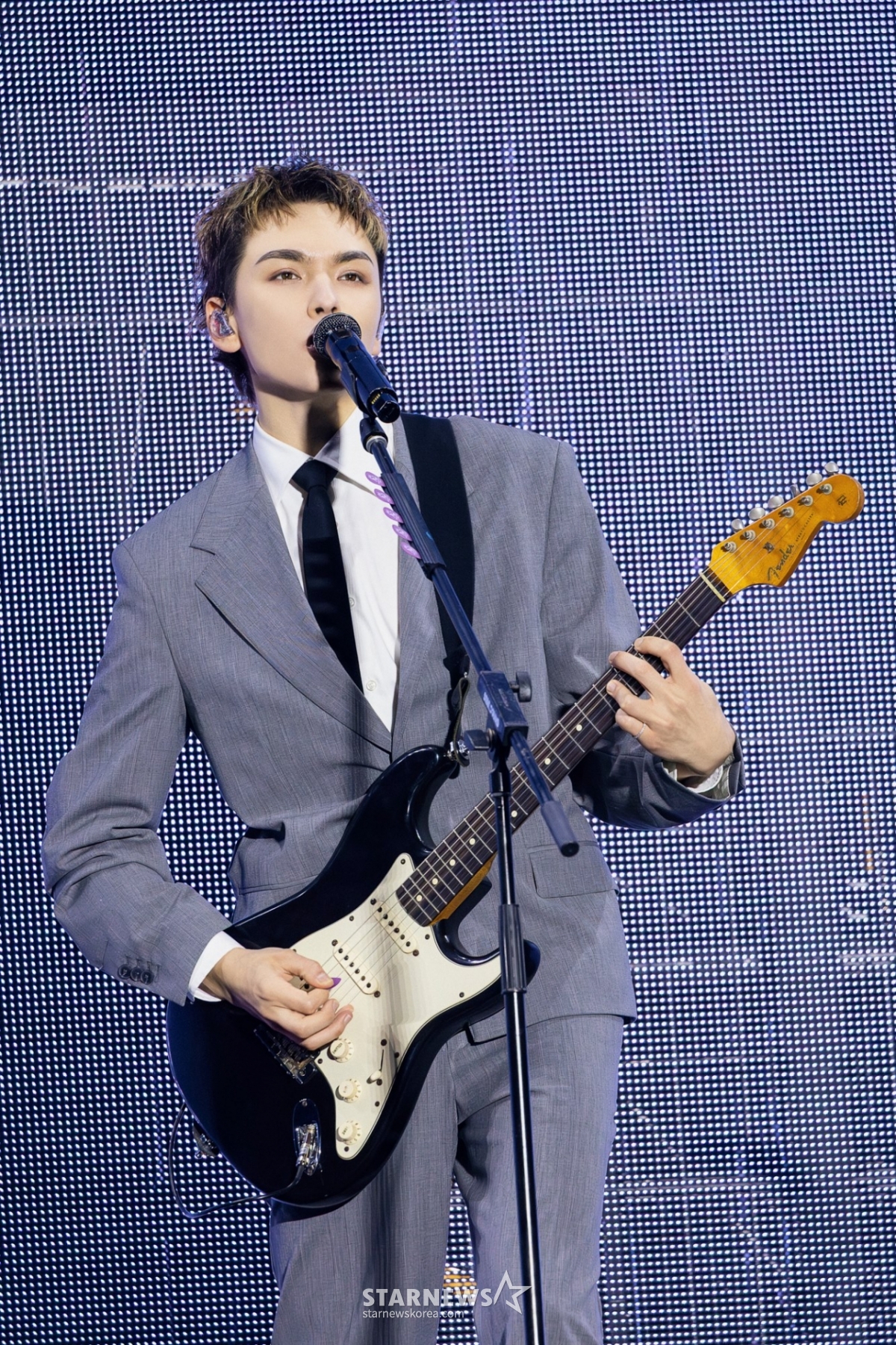 *此内容由AI翻译生成。组合Seventeen Vernon5日下午在仁川亚洲主体育场举行的"SEVENTEEN WORLD TOUR [NEW_]ENCORE"演唱会上进行了精彩的演出。 =照片제공pledis娱乐公司2026.04.05© STARNEWS. 未经许可禁止转载或再分发*此内容由AI翻译生成。