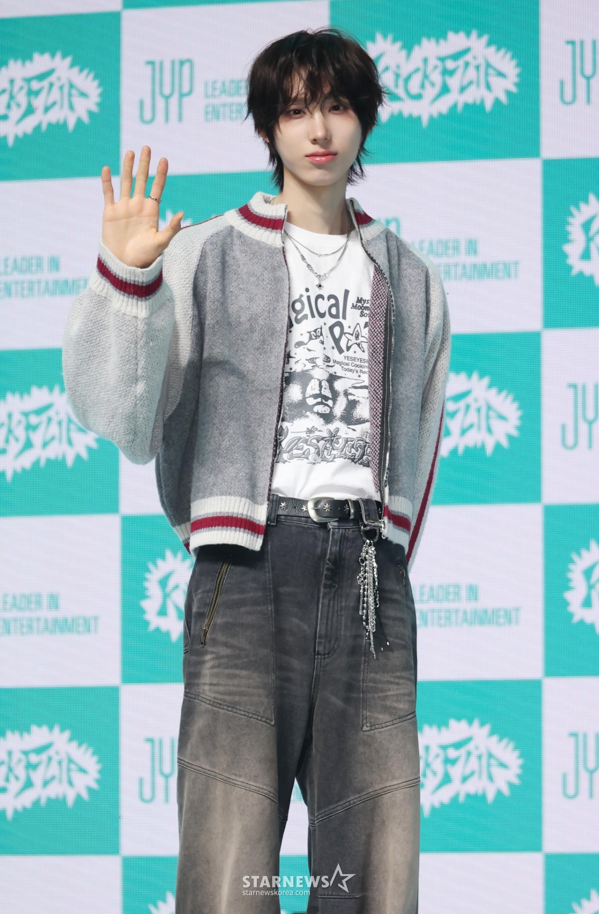 组合KickFlip主王6日下午在首尔广津区YES24 Live Hall举行的第四张迷你专辑《My First Kick》发行纪念表演秀上摆出造型,供记者们拍照。
