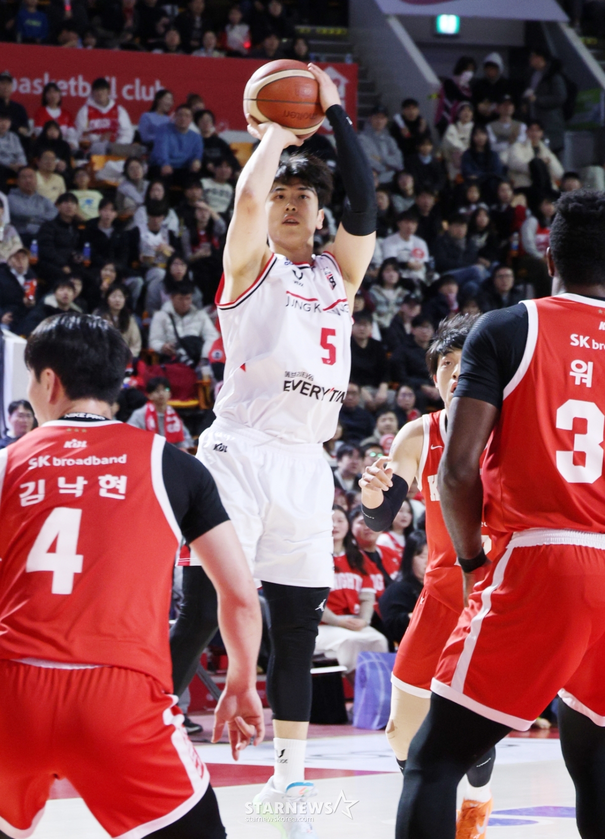*此内容由AI翻译生成。1日,2025-2026 KBL职业篮球联赛首尔SK对安养正官庄的比赛在首尔蚕室学生体育馆举行。图为正官庄边俊亨在与SK沃尼交手之前试图投进3分球。© STARNEWS. 未经许可禁止转载或再分发*此内容由AI翻译生成。