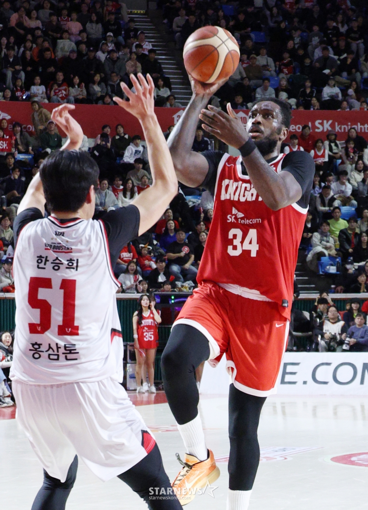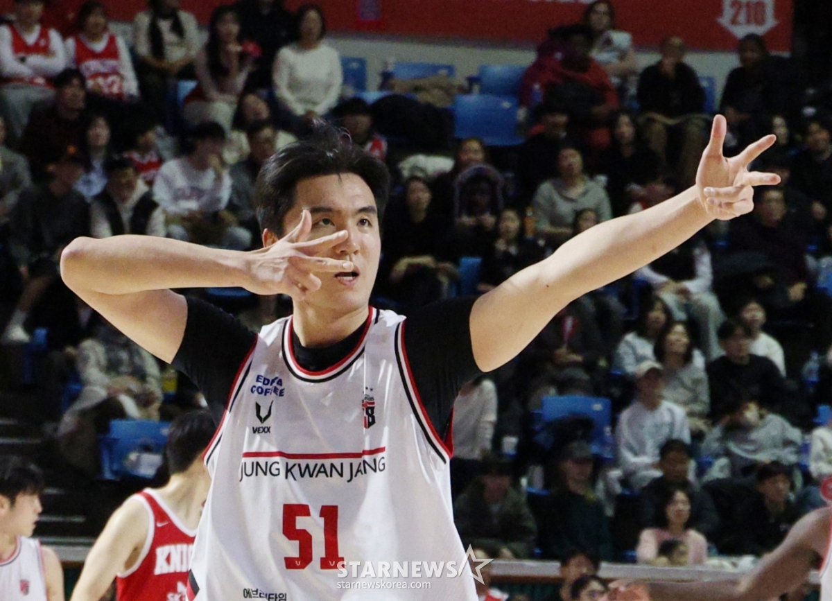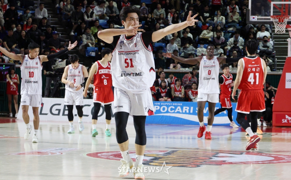 正官庄韩胜熙在每个胜负点都投进了3分球,攻下了SK Knights城。