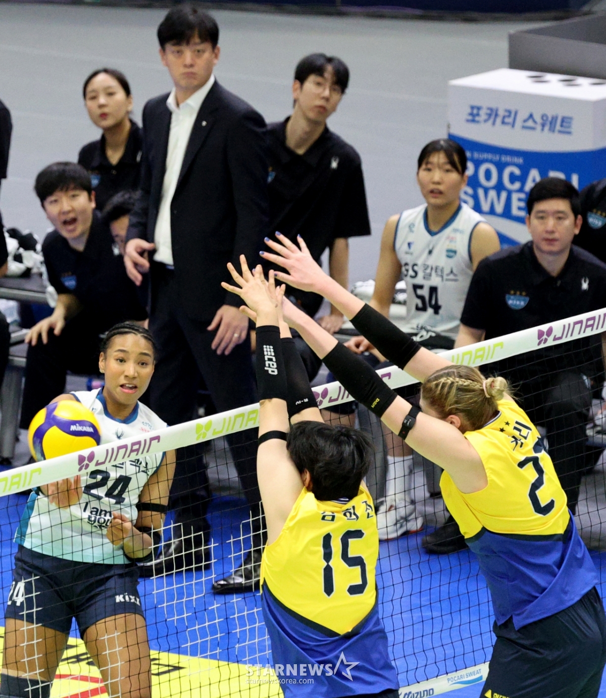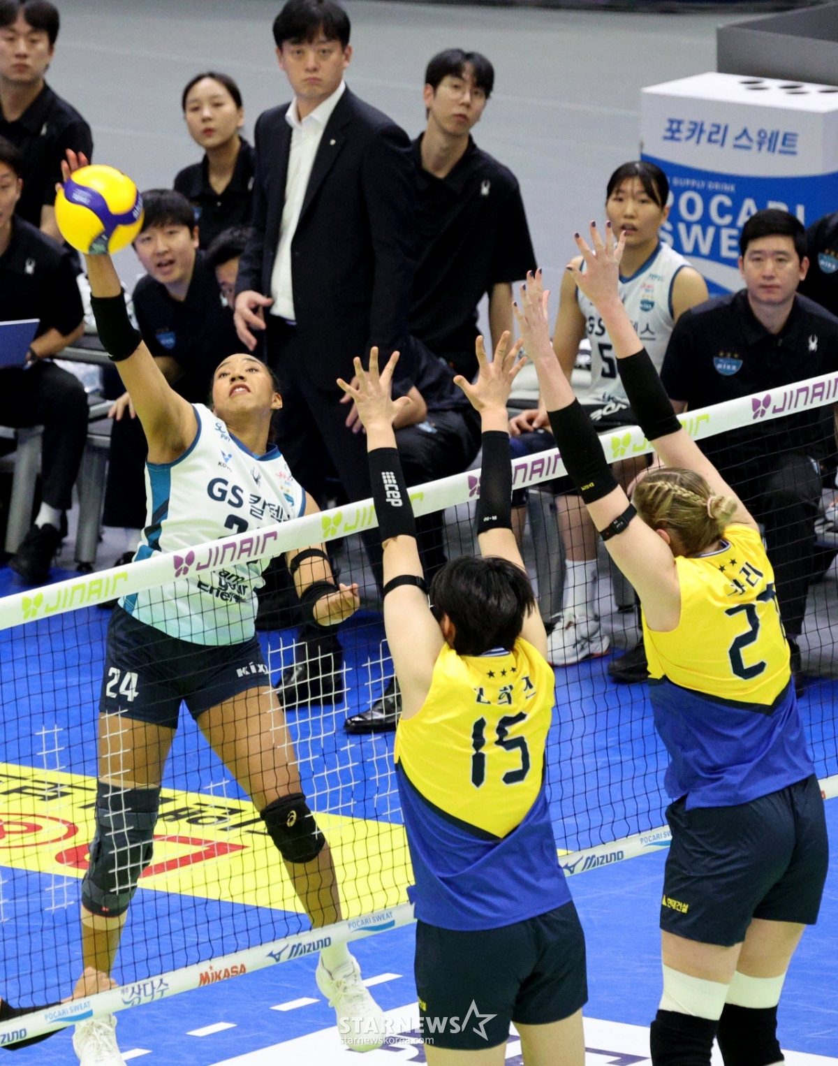 3日,GS Raya在水原体育馆举行的2025-2026真航空V联赛女子组现代建设队和GS加德士队的比赛中,试图对现代队的金熙珍(音)的双重拦网进行强力打击。 2026.01.03.