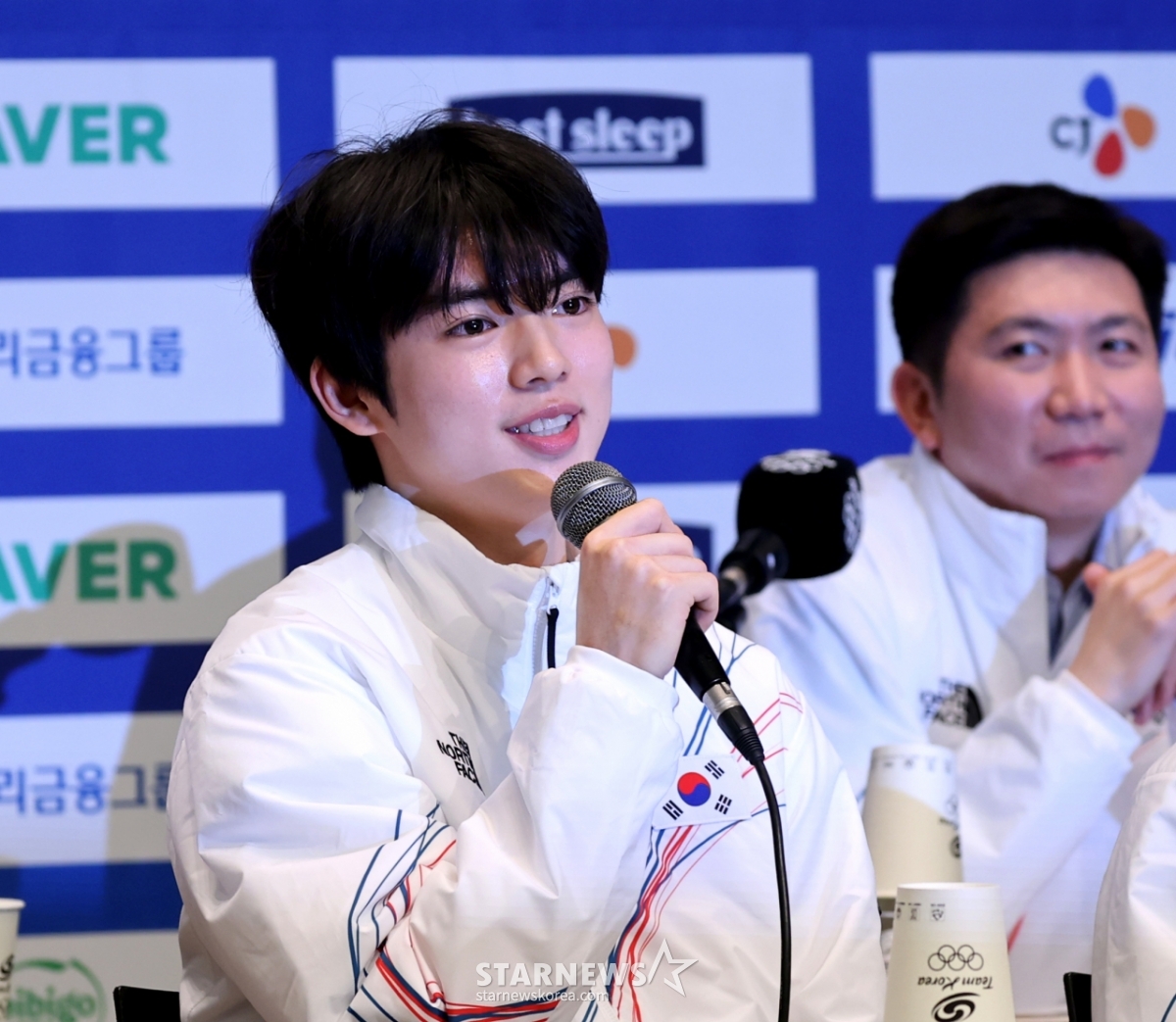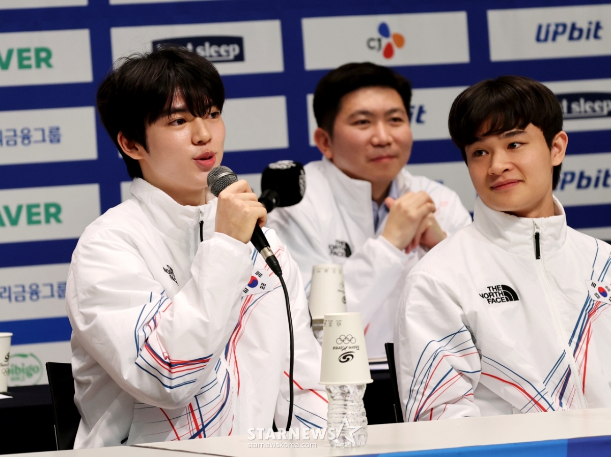 7日,在镇川国家代表训练场举行的2026米兰-科尔蒂纳冬奥会d-30媒体日上,花样滑冰车俊焕正在回答记者的提问。 2026.01.07.