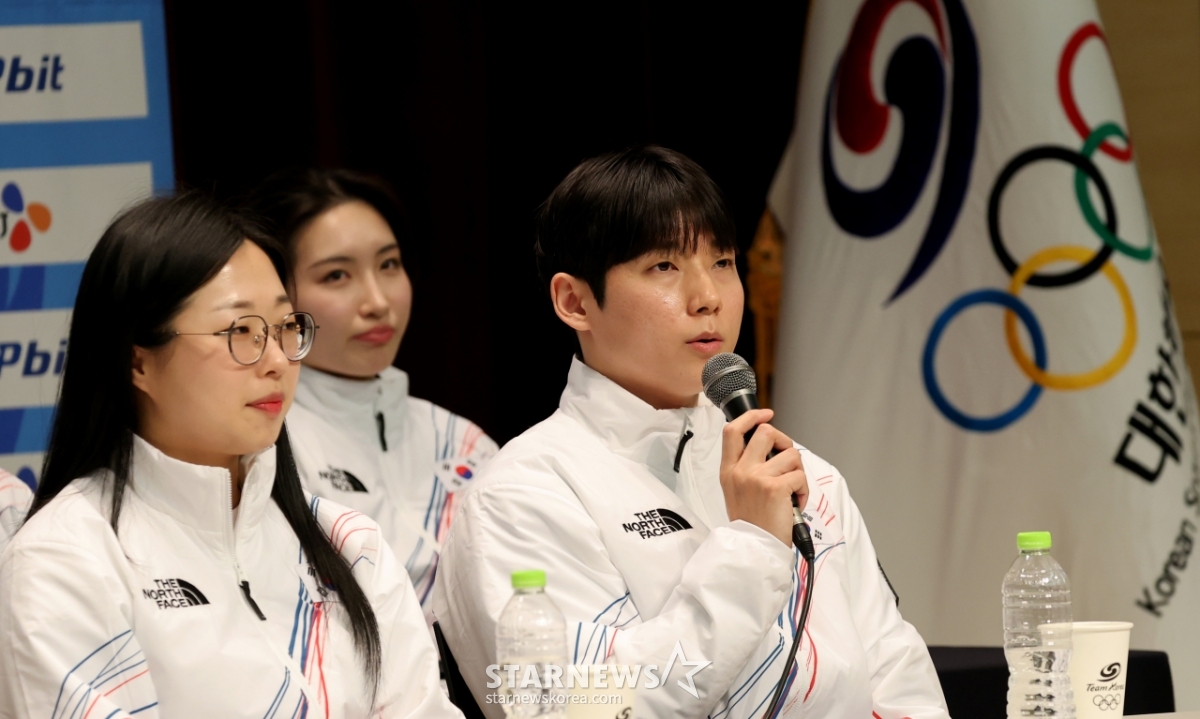7日,在镇川国家代表训练场举行的2026米兰-科尔蒂纳冬奥会d-30媒体日上,冰壶选手郑永锡(音)正在回答记者的提问。 左侧是组成队伍的金善英。 2026.01.07.