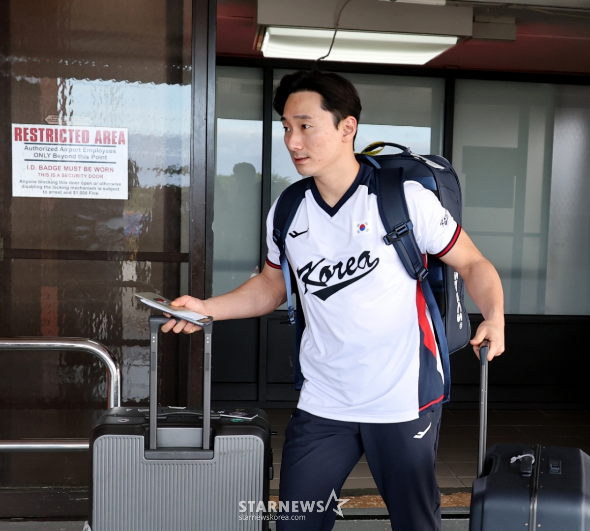 9日,棒球代表队内野手申敏宰通过仁川机场进入WBC第一次转地训练地塞班岛,正在接受欢迎项链的礼物。 2026.01.09.