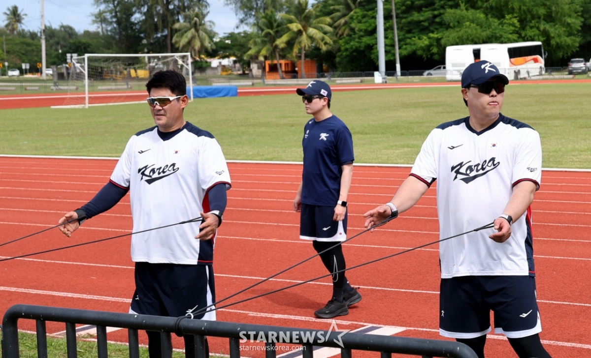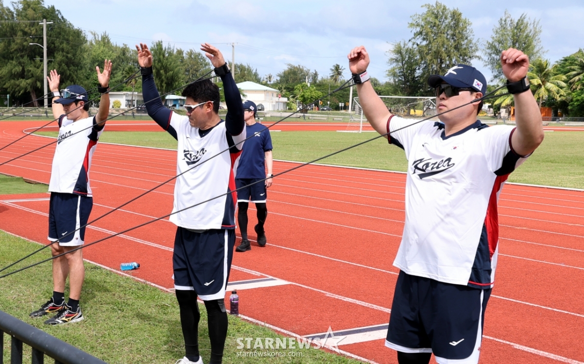 棒球代表队柳贤振、卢景恩等高年资投手们10日在塞班岛Olleye Sports Complex举行的转地训练第一天,正在用救生圈锻炼肩膀。 2026.01.10.